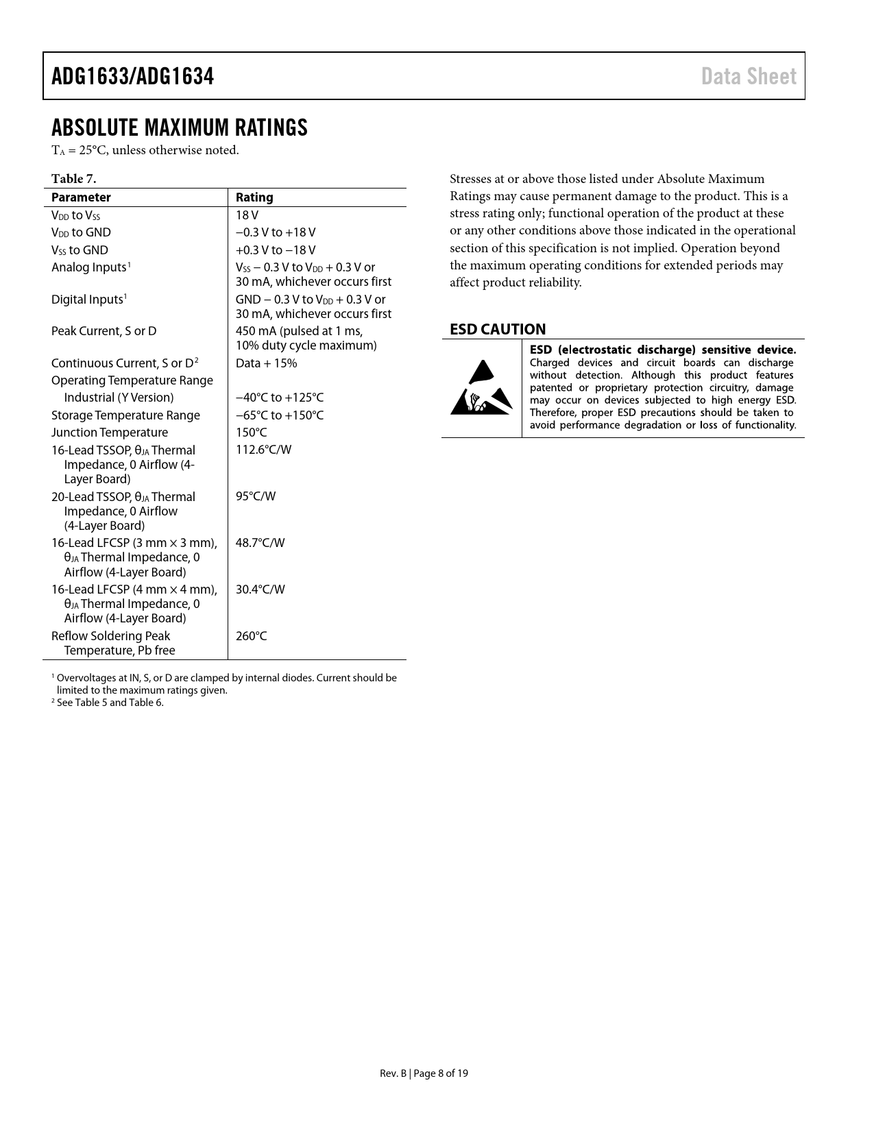link to page 7 link to page 7 ADG1633/ADG1634Data SheetABSOLUTE MAXIMUM RATINGS TA = 25°C, unless otherwise noted. Table 7. Stresses at or above those listed under Absolute Maximum ParameterRating Ratings may cause permanent damage to the product. This is a VDD to VSS 18 V stress rating only; functional operation of the product at these VDD to GND −0.3 V to +18 V or any other conditions above those indicated in the operational VSS to GND +0.3 V to −18 V section of this specification is not implied. Operation beyond Analog Inputs1 VSS − 0.3 V to VDD + 0.3 V or the maximum operating conditions for extended periods may 30 mA, whichever occurs first affect product reliability. Digital Inputs1 GND − 0.3 V to VDD + 0.3 V or 30 mA, whichever occurs first Peak Current, S or D 450 mA (pulsed at 1 ms, ESD CAUTION 10% duty cycle maximum) Continuous Current, S or D2 Data + 15% Operating Temperature Range Industrial (Y Version) −40°C to +125°C Storage Temperature Range −65°C to +150°C Junction Temperature 150°C 16-Lead TSSOP, θJA Thermal 112.6°C/W Impedance, 0 Airflow (4- Layer Board) 20-Lead TSSOP, θJA Thermal 95°C/W Impedance, 0 Airflow (4-Layer Board) 16-Lead LFCSP (3 mm × 3 mm), 48.7°C/W θJA Thermal Impedance, 0 Airflow (4-Layer Board) 16-Lead LFCSP (4 mm × 4 mm), 30.4°C/W θJA Thermal Impedance, 0 Airflow (4-Layer Board) Reflow Soldering Peak 260°C Temperature, Pb free 1 Overvoltages at IN, S, or D are clamped by internal diodes. Current should be limited to the maximum ratings given. 2 See Table 5 and Table 6. Rev. B | Page 8 of 19 Document Outline FEATURES APPLICATIONS GENERAL DESCRIPTION FUNCTIONAL BLOCK DIAGRAMS TABLE OF CONTENTS REVISION HISTORY SPECIFICATIONS ±5 V DUAL SUPPLY 12 V SINGLE SUPPLY 5 V SINGLE SUPPLY 3.3 V SINGLE SUPPLY CONTINUOUS CURRENT PER CHANNEL, S OR D ABSOLUTE MAXIMUM RATINGS ESD CAUTION PIN CONFIGURATIONS AND FUNCTION DESCRIPTIONS TYPICAL PERFORMANCE CHARACTERISTICS TEST CIRCUITS TERMINOLOGY OUTLINE DIMENSIONS ORDERING GUIDE