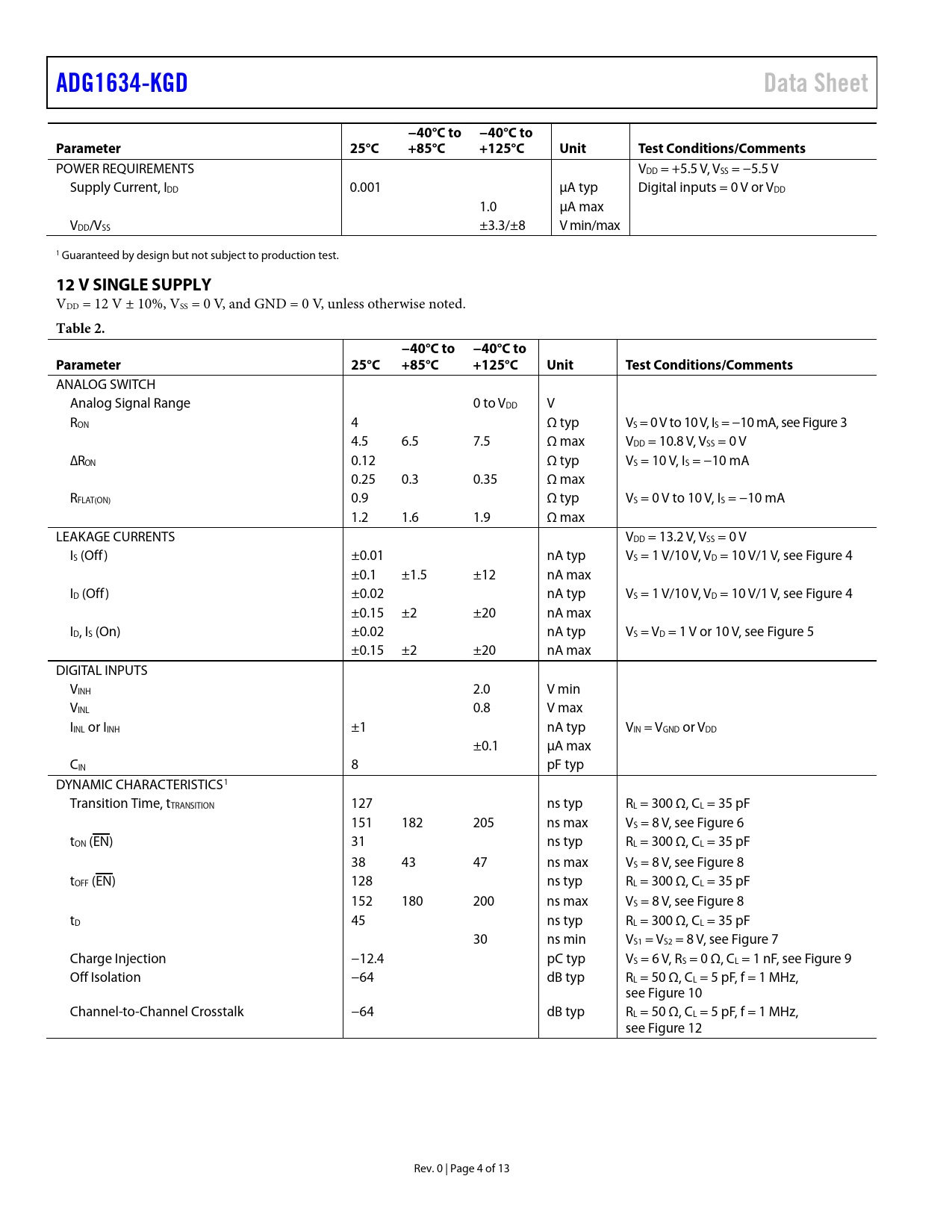 link to page 11 link to page 11 link to page 11 link to page 11 link to page 11 link to page 11 link to page 11 link to page 11 link to page 12 link to page 12 link to page 12 link to page 5 ADG1634-KGDData Sheet−40°C to −40°C toParameter25°C+85°C+125°CUnitTest Conditions/Comments POWER REQUIREMENTS VDD = +5.5 V, VSS = −5.5 V Supply Current, IDD 0.001 µA typ Digital inputs = 0 V or VDD 1.0 µA max VDD/VSS ±3.3/±8 V min/max 1 Guaranteed by design but not subject to production test. 12 V SINGLE SUPPLY VDD = 12 V ± 10%, VSS = 0 V, and GND = 0 V, unless otherwise noted. Table 2.−40°C to −40°C toParameter25°C +85°C+125°CUnitTest Conditions/Comments ANALOG SWITCH Analog Signal Range 0 to VDD V RON 4 Ω typ VS = 0 V to 10 V, IS = −10 mA, see Figure 3 4.5 6.5 7.5 Ω max VDD = 10.8 V, VSS = 0 V ∆RON 0.12 Ω typ VS = 10 V, IS = −10 mA 0.25 0.3 0.35 Ω max RFLAT(ON) 0.9 Ω typ VS = 0 V to 10 V, IS = −10 mA 1.2 1.6 1.9 Ω max LEAKAGE CURRENTS VDD = 13.2 V, VSS = 0 V IS (Off) ±0.01 nA typ VS = 1 V/10 V, VD = 10 V/1 V, see Figure 4 ±0.1 ±1.5 ±12 nA max ID (Off) ±0.02 nA typ VS = 1 V/10 V, VD = 10 V/1 V, see Figure 4 ±0.15 ±2 ±20 nA max ID, IS (On) ±0.02 nA typ VS = VD = 1 V or 10 V, see Figure 5 ±0.15 ±2 ±20 nA max DIGITAL INPUTS VINH 2.0 V min VINL 0.8 V max IINL or IINH ±1 nA typ VIN = VGND or VDD ±0.1 µA max CIN 8 pF typ DYNAMIC CHARACTERISTICS1 Transition Time, tTRANSITION 127 ns typ RL = 300 Ω, CL = 35 pF 151 182 205 ns max VS = 8 V, see Figure 6 tON (EN) 31 ns typ RL = 300 Ω, CL = 35 pF 38 43 47 ns max VS = 8 V, see Figure 8 tOFF (EN) 128 ns typ RL = 300 Ω, CL = 35 pF 152 180 200 ns max VS = 8 V, see Figure 8 tD 45 ns typ RL = 300 Ω, CL = 35 pF 30 ns min VS1 = VS2 = 8 V, see Figure 7 Charge Injection −12.4 pC typ VS = 6 V, RS = 0 Ω, CL = 1 nF, see Figure 9 Off Isolation −64 dB typ RL = 50 Ω, CL = 5 pF, f = 1 MHz, see Figure 10 Channel-to-Channel Crosstalk −64 dB typ RL = 50 Ω, CL = 5 pF, f = 1 MHz, see Figure 12 Rev. 0 | Page 4 of 13 Document Outline FEATURES APPLICATIONS GENERAL DESCRIPTION FUNCTIONAL BLOCK DIAGRAM TABLE OF CONTENTS REVISION HISTORY SPECIFICATIONS ±5 V DUAL SUPPLY 12 V SINGLE SUPPLY 5 V SINGLE SUPPLY 3.3 V SINGLE SUPPLY CONTINUOUS CURRENT PER CHANNEL, S OR D ABSOLUTE MAXIMUM RATINGS ESD CAUTION PIN CONFIGURATION AND FUNCTION DESCRIPTIONS TEST CIRCUITS OUTLINE DIMENSIONS DIE SPECIFICATIONS AND ASSEMBLY RECOMMENDATIONS ORDERING GUIDE