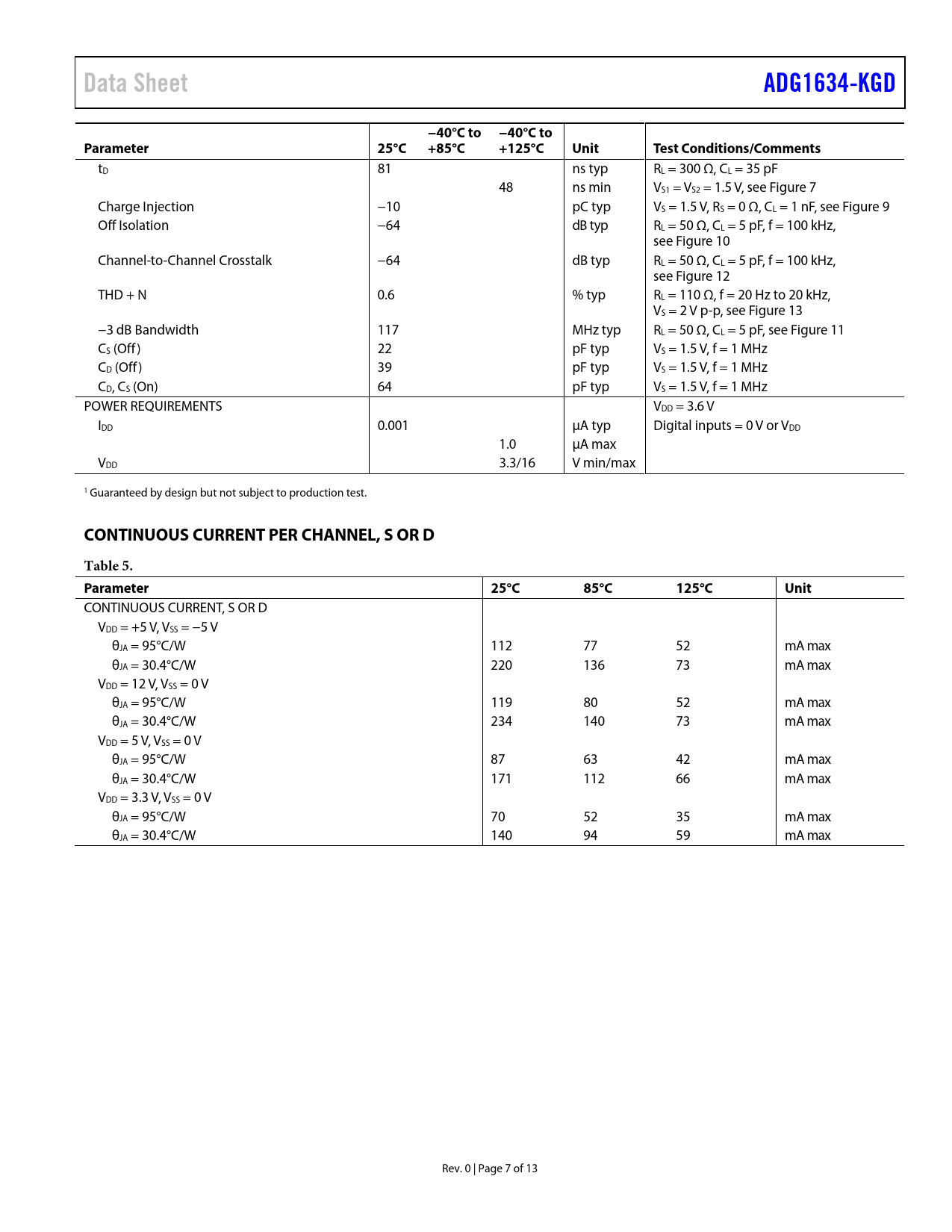 link to page 11 link to page 12 link to page 12 link to page 12 link to page 12 link to page 12 Data SheetADG1634-KGD−40°C to −40°C toParameter25°C +85°C+125°CUnitTest Conditions/Comments tD 81 ns typ RL = 300 Ω, CL = 35 pF 48 ns min VS1 = VS2 = 1.5 V, see Figure 7 Charge Injection −10 pC typ VS = 1.5 V, RS = 0 Ω, CL = 1 nF, see Figure 9 Off Isolation −64 dB typ RL = 50 Ω, CL = 5 pF, f = 100 kHz, see Figure 10 Channel-to-Channel Crosstalk −64 dB typ RL = 50 Ω, CL = 5 pF, f = 100 kHz, see Figure 12 THD + N 0.6 % typ RL = 110 Ω, f = 20 Hz to 20 kHz, VS = 2 V p-p, see Figure 13 −3 dB Bandwidth 117 MHz typ RL = 50 Ω, CL = 5 pF, see Figure 11 CS (Off) 22 pF typ VS = 1.5 V, f = 1 MHz CD (Off) 39 pF typ VS = 1.5 V, f = 1 MHz CD, CS (On) 64 pF typ VS = 1.5 V, f = 1 MHz POWER REQUIREMENTS VDD = 3.6 V IDD 0.001 µA typ Digital inputs = 0 V or VDD 1.0 µA max VDD 3.3/16 V min/max 1 Guaranteed by design but not subject to production test. CONTINUOUS CURRENT PER CHANNEL, S OR DTable 5. Parameter25°C85°C125°CUnit CONTINUOUS CURRENT, S OR D VDD = +5 V, VSS = −5 V θJA = 95°C/W 112 77 52 mA max θJA = 30.4°C/W 220 136 73 mA max VDD = 12 V, VSS = 0 V θJA = 95°C/W 119 80 52 mA max θJA = 30.4°C/W 234 140 73 mA max VDD = 5 V, VSS = 0 V θJA = 95°C/W 87 63 42 mA max θJA = 30.4°C/W 171 112 66 mA max VDD = 3.3 V, VSS = 0 V θJA = 95°C/W 70 52 35 mA max θJA = 30.4°C/W 140 94 59 mA max Rev. 0 | Page 7 of 13 Document Outline FEATURES APPLICATIONS GENERAL DESCRIPTION FUNCTIONAL BLOCK DIAGRAM TABLE OF CONTENTS REVISION HISTORY SPECIFICATIONS ±5 V DUAL SUPPLY 12 V SINGLE SUPPLY 5 V SINGLE SUPPLY 3.3 V SINGLE SUPPLY CONTINUOUS CURRENT PER CHANNEL, S OR D ABSOLUTE MAXIMUM RATINGS ESD CAUTION PIN CONFIGURATION AND FUNCTION DESCRIPTIONS TEST CIRCUITS OUTLINE DIMENSIONS DIE SPECIFICATIONS AND ASSEMBLY RECOMMENDATIONS ORDERING GUIDE