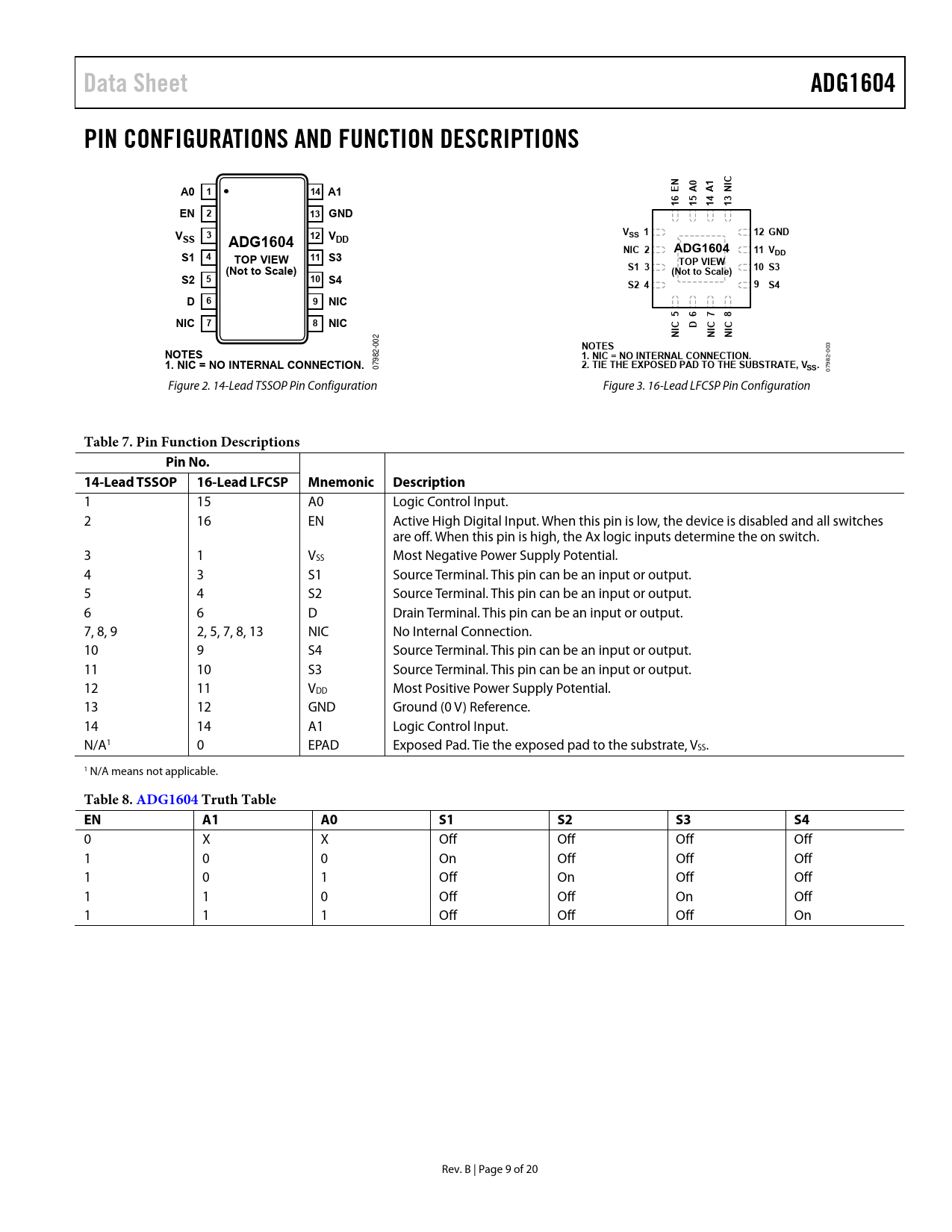 Pages / Page20 / 9 — Data Sheet. ADG1604. PIN CONFIGURATIONS AND FUNCTION DESCRIPTIONS. A0 1. …