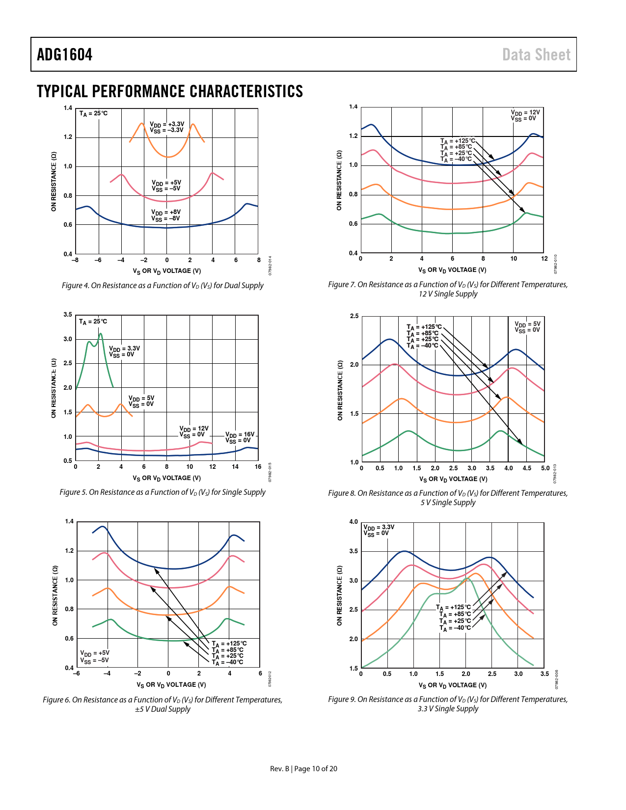 07982- 07982- Figure 4. On Resistance as a Function of VD (VS) for Dual Supply Figure 7. On Resistance as a Function of VD (VS) for Different Temperatures, 12 V Single Supply
