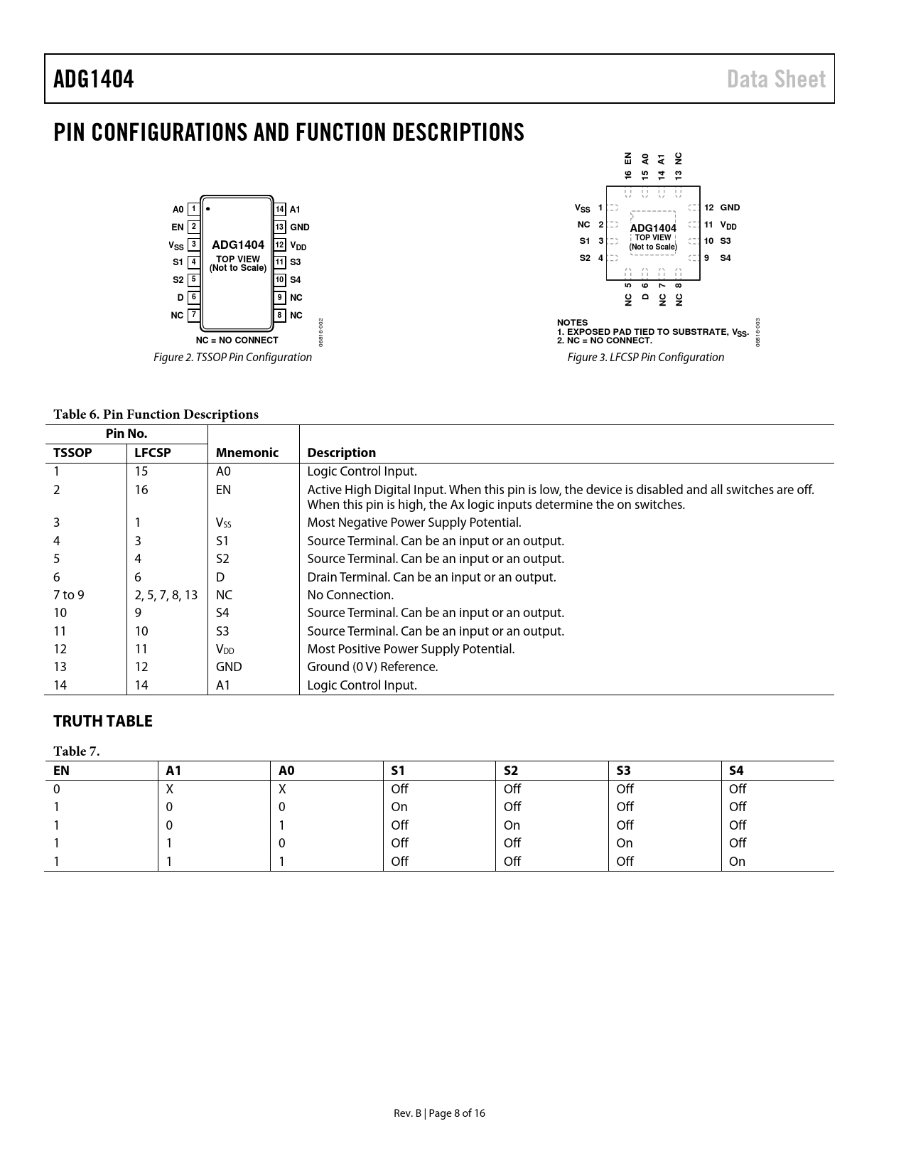 Pages / Page16 / 8 — ADG1404. Data Sheet. PIN CONFIGURATIONS AND FUNCTION DESCRIPTIONS. A0 1. …