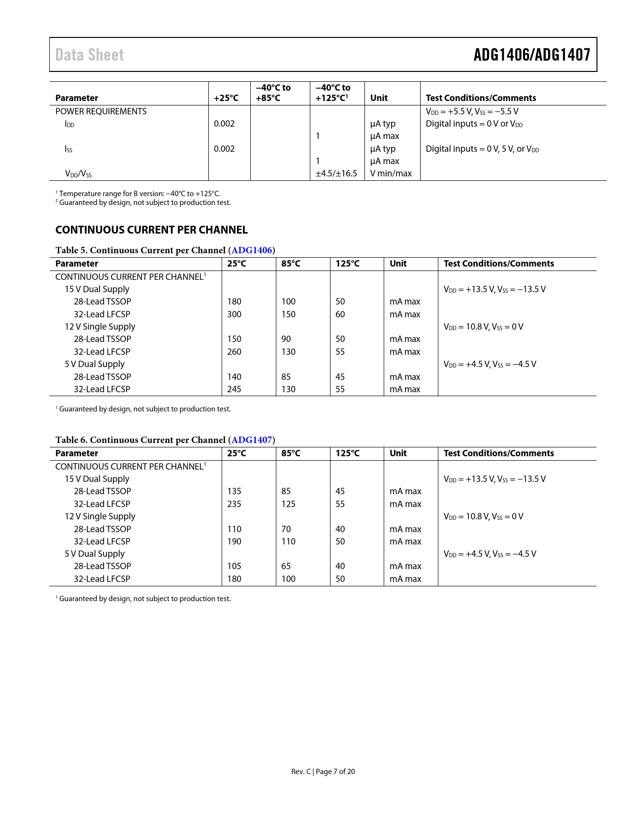 Data Sheet. ADG1406/ADG1407. −40°C to. Parameter +25°C. +85°C. +125°C1 Unit. Test. Conditions/Comments. CONTINUOUS CURRENT PER CHANNEL