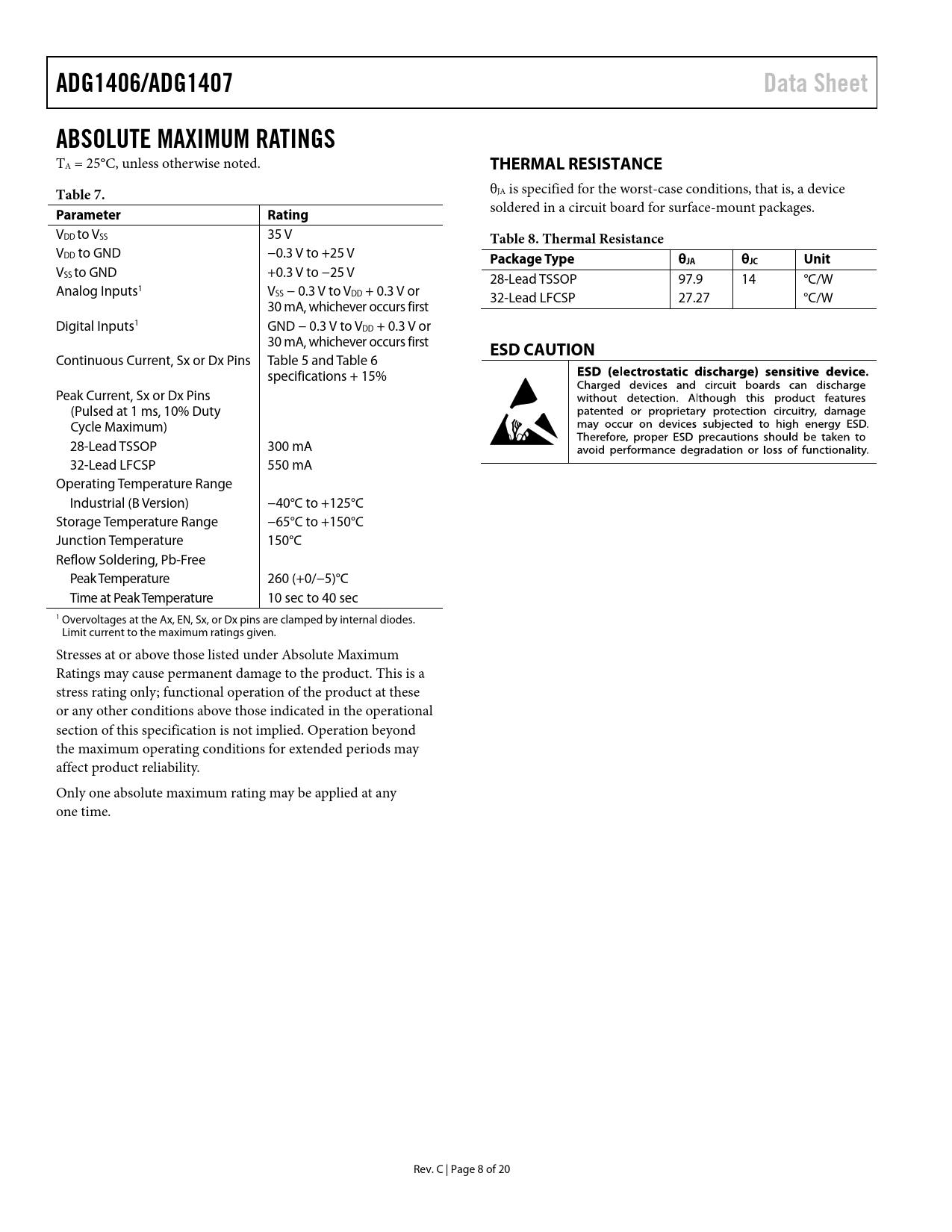 Pages / Page20 / 8 — ADG1406/ADG1407. Data Sheet. ABSOLUTE MAXIMUM RATINGS. THERMAL …