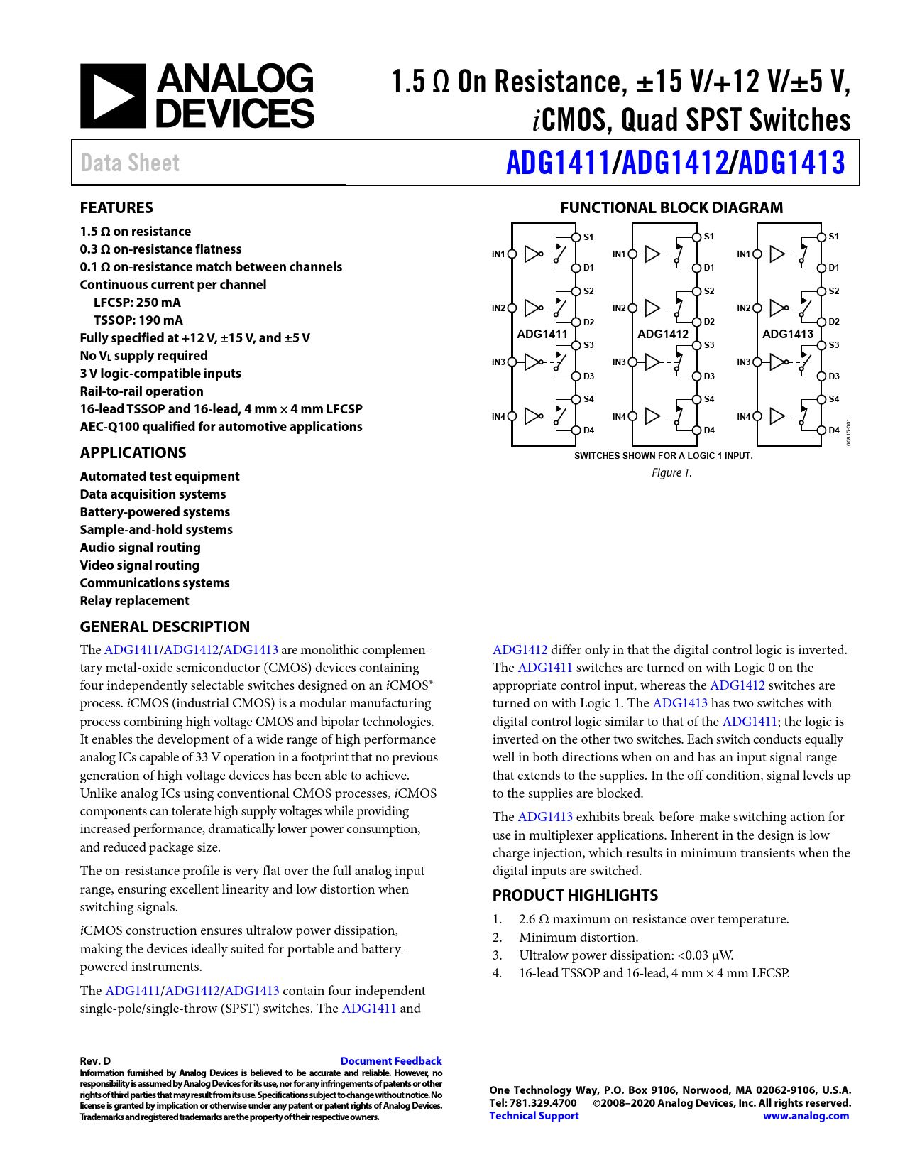1.5 Ω On Resistance, ±15 V/+12 V/±5 V,. CMOS, Quad SPST Switches. Data Sheet. ADG1411/. ADG1412/. ADG1413. FEATURES