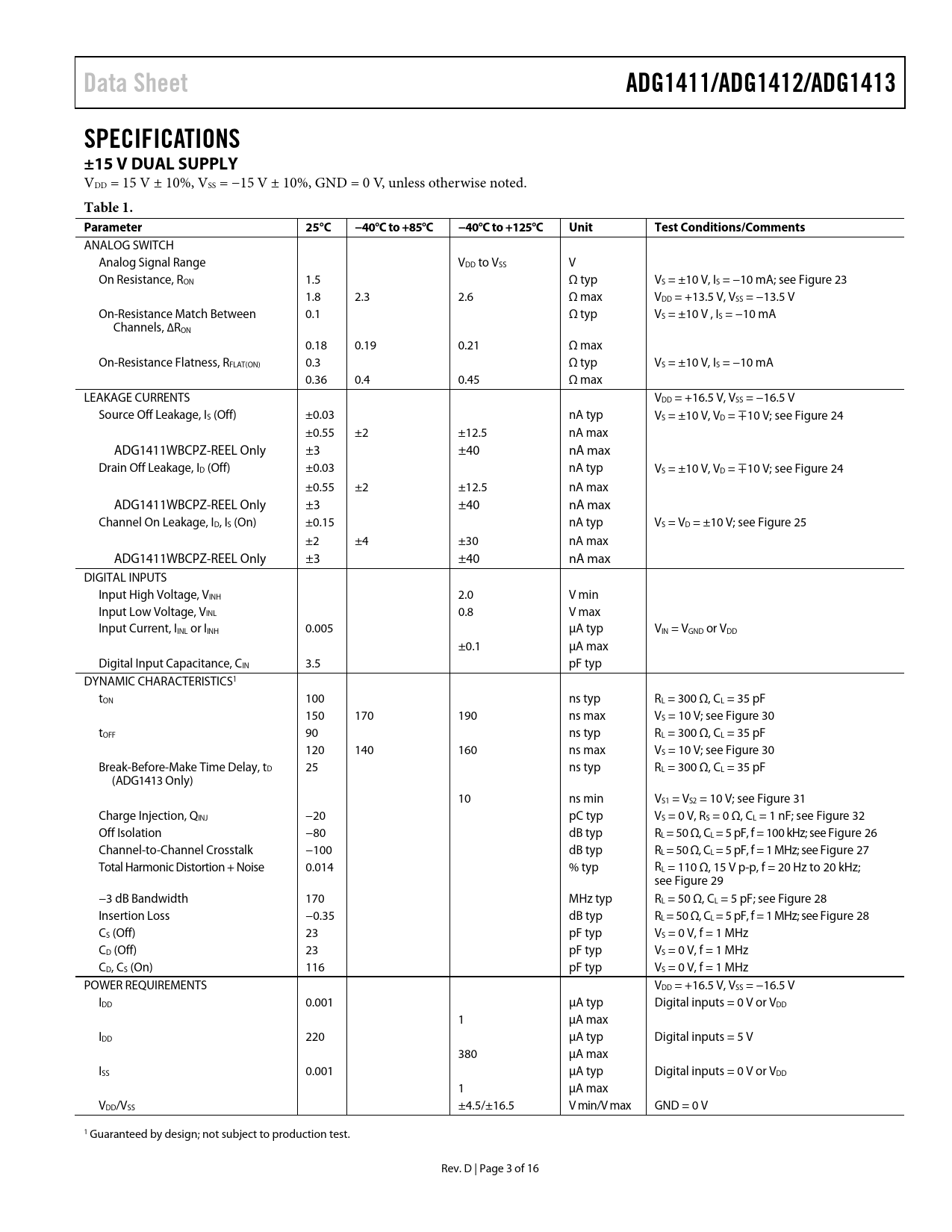 Data Sheet. ADG1411/ADG1412/ADG1413. SPECIFICATIONS ±15 V DUAL SUPPLY. Table 1. Parameter. 25°C. −40°C to +85°C. −40°C to +125°C
