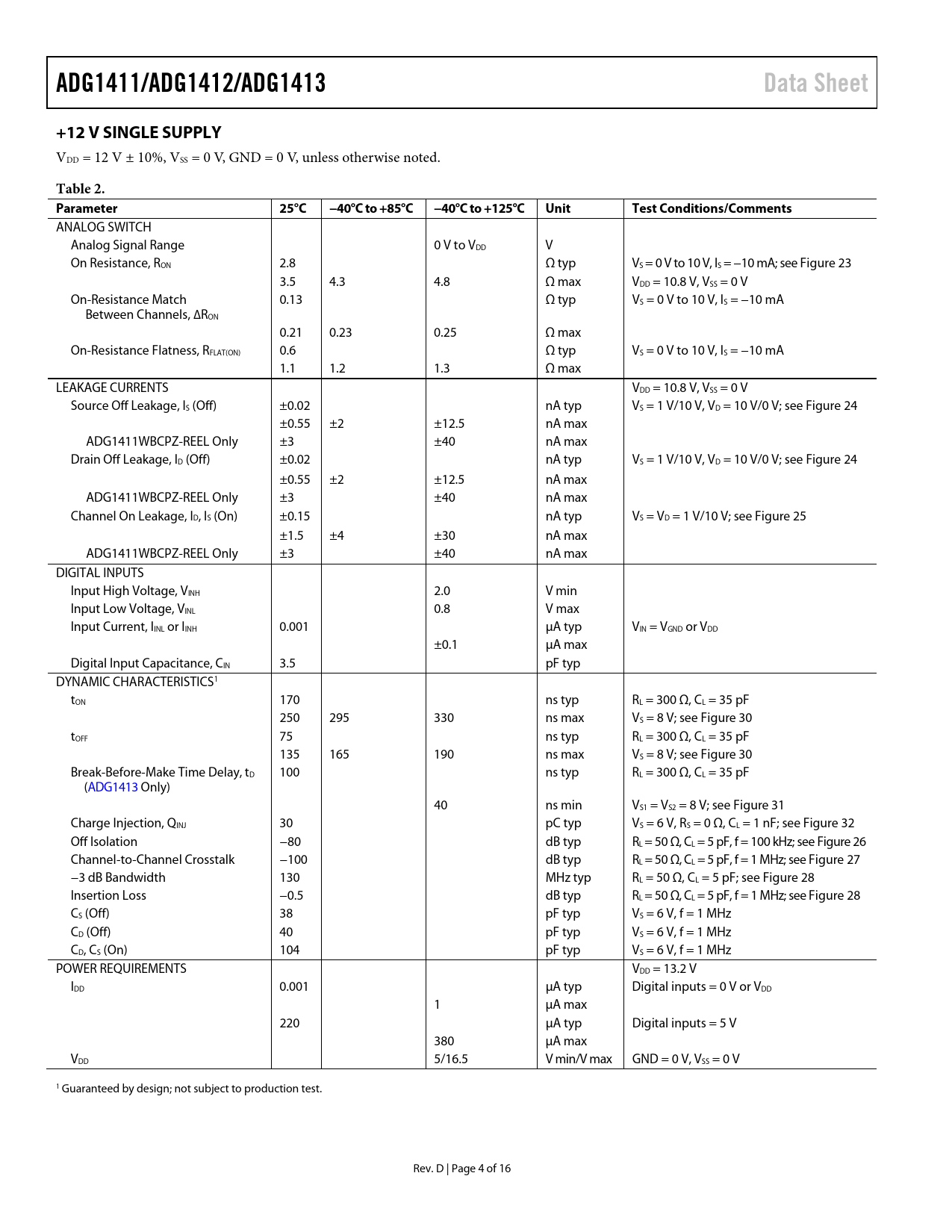 link to page 13 link to page 13 link to page 13 link to page 13 link to page 14 link to page 14 link to page 14 link to page 14 link to page 13 link to page 13 link to page 13 link to page 13 ADG1411/ADG1412/ADG1413Data Sheet+12 V SINGLE SUPPLY VDD = 12 V ± 10%, VSS = 0 V, GND = 0 V, unless otherwise noted. Table 2. Parameter25°C−40°C to +85°C−40°C to +125°CUnitTest Conditions/Comments ANALOG SWITCH Analog Signal Range 0 V to VDD V On Resistance, RON 2.8 Ω typ VS = 0 V to 10 V, IS = −10 mA; see Figure 23 3.5 4.3 4.8 Ω max VDD = 10.8 V, VSS = 0 V On-Resistance Match 0.13 Ω typ VS = 0 V to 10 V, IS = −10 mA Between Channels, ∆RON 0.21 0.23 0.25 Ω max On-Resistance Flatness, RFLAT(ON) 0.6 Ω typ VS = 0 V to 10 V, IS = −10 mA 1.1 1.2 1.3 Ω max LEAKAGE CURRENTS VDD = 10.8 V, VSS = 0 V Source Off Leakage, IS (Off) ±0.02 nA typ VS = 1 V/10 V, VD = 10 V/0 V; see Figure 24 ±0.55 ±2 ±12.5 nA max ADG1411WBCPZ-REEL Only ±3 ±40 nA max Drain Off Leakage, ID (Off) ±0.02 nA typ VS = 1 V/10 V, VD = 10 V/0 V; see Figure 24 ±0.55 ±2 ±12.5 nA max ADG1411WBCPZ-REEL Only ±3 ±40 nA max Channel On Leakage, ID, IS (On) ±0.15 nA typ VS = VD = 1 V/10 V; see Figure 25 ±1.5 ±4 ±30 nA max ADG1411WBCPZ-REEL Only ±3 ±40 nA max DIGITAL INPUTS Input High Voltage, VINH 2.0 V min Input Low Voltage, VINL 0.8 V max Input Current, IINL or IINH 0.001 µA typ VIN = VGND or VDD ±0.1 µA max Digital Input Capacitance, CIN 3.5 pF typ DYNAMIC CHARACTERISTICS1 tON 170 ns typ RL = 300 Ω, CL = 35 pF 250 295 330 ns max VS = 8 V; see Figure 30 tOFF 75 ns typ RL = 300 Ω, CL = 35 pF 135 165 190 ns max VS = 8 V; see Figure 30 Break-Before-Make Time Delay, tD 100 ns typ RL = 300 Ω, CL = 35 pF (ADG1413 Only) 40 ns min VS1 = VS2 = 8 V; see Figure 31 Charge Injection, QINJ 30 pC typ VS = 6 V, RS = 0 Ω, CL = 1 nF; see Figure 32 Off Isolation −80 dB typ RL = 50 Ω, CL = 5 pF, f = 100 kHz; see Figure 26 Channel-to-Channel Crosstalk −100 dB typ RL = 50 Ω, CL = 5 pF, f = 1 MHz; see Figure 27 −3 dB Bandwidth 130 MHz typ RL = 50 Ω, CL = 5 pF; see Figure 28 Insertion Loss −0.5 dB typ RL = 50 Ω, CL = 5 pF, f = 1 MHz; see Figure 28 CS (Off) 38 pF typ VS = 6 V, f = 1 MHz CD (Off) 40 pF typ VS = 6 V, f = 1 MHz CD, CS (On) 104 pF typ VS = 6 V, f = 1 MHz POWER REQUIREMENTS VDD = 13.2 V IDD 0.001 µA typ Digital inputs = 0 V or VDD 1 µA max 220 µA typ Digital inputs = 5 V 380 µA max VDD 5/16.5 V min/V max GND = 0 V, VSS = 0 V 1 Guaranteed by design; not subject to production test. Rev. D | Page 4 of 16 Document Outline FEATURES APPLICATIONS FUNCTIONAL BLOCK DIAGRAM GENERAL DESCRIPTION PRODUCT HIGHLIGHTS TABLE OF CONTENTS REVISION HISTORY SPECIFICATIONS ±15 V DUAL SUPPLY +12 V SINGLE SUPPLY ±5 V DUAL SUPPLY ABSOLUTE MAXIMUM RATINGS ESD CAUTION PIN CONFIGURATIONS AND FUNCTION DESCRIPTIONS TYPICAL PERFORMANCE CHARACTERISTICS TERMINOLOGY TEST CIRCUITS OUTLINE DIMENSIONS ORDERING GUIDE AUTOMOTIVE PRODUCTS