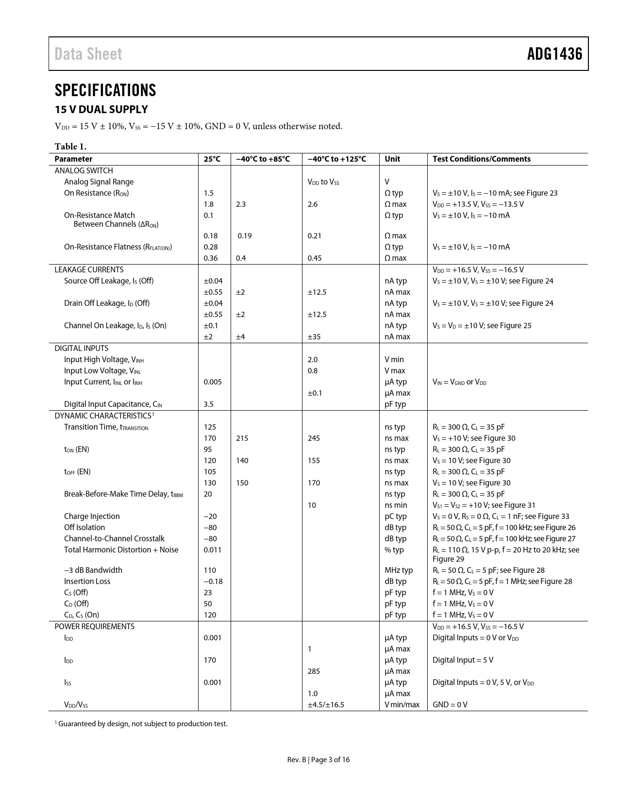 Pages / Page16 / 3 — Data Sheet. ADG1436. SPECIFICATIONS 15 V DUAL SUPPLY. Table 1. Parameter. …