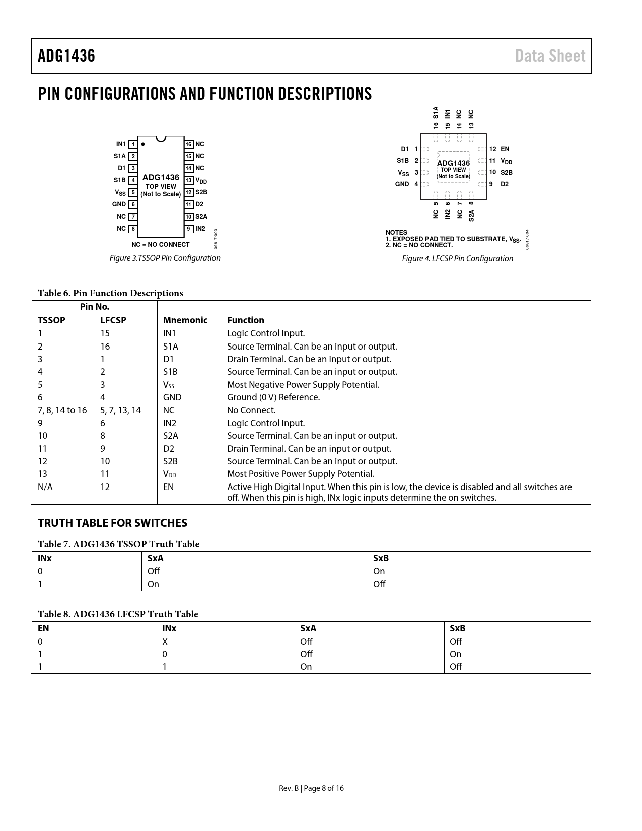 ADG1436Data SheetPIN CONFIGURATIONS AND FUNCTION DESCRIPTIONS1AIN1SNCNC16151413IN1116 NCD1 112 ENS1A215 NCS1B211 VDDADG1436D1314 NCV3TOP VIEW10SSS2B(Not to Scale)S1BADG1436413 VDDTOP VIEWGND 49D2VSS 512 S2B(Not to Scale)GND611 D25678NC710 S2ANCIN2NC2A SNC89IN2NOTES 003 004 1. EXPOSED PAD TIED TO SUBSTRATE, VSS.NC = NO CONNECT2. NC = NO CONNECT. 06817- 06817- Figure 3.TSSOP Pin Configuration Figure 4. LFCSP Pin Configuration Table 6. Pin Function DescriptionsPin No.TSSOPLFCSPMnemonicFunction 1 15 IN1 Logic Control Input. 2 16 S1A Source Terminal. Can be an input or output. 3 1 D1 Drain Terminal. Can be an input or output. 4 2 S1B Source Terminal. Can be an input or output. 5 3 VSS Most Negative Power Supply Potential. 6 4 GND Ground (0 V) Reference. 7, 8, 14 to 16 5, 7, 13, 14 NC No Connect. 9 6 IN2 Logic Control Input. 10 8 S2A Source Terminal. Can be an input or output. 11 9 D2 Drain Terminal. Can be an input or output. 12 10 S2B Source Terminal. Can be an input or output. 13 11 VDD Most Positive Power Supply Potential. N/A 12 EN Active High Digital Input. When this pin is low, the device is disabled and all switches are off. When this pin is high, INx logic inputs determine the on switches. TRUTH TABLE FOR SWITCHESTable 7. ADG1436 TSSOP Truth Table INxSxASxB 0 Off On 1 On Off Table 8. ADG1436 LFCSP Truth Table ENINxSxASxB 0 X Off Off 1 0 Off On 1 1 On Off Rev. B | Page 8 of 16 Document Outline Features Applications Functional Block Diagrams General Description Product Highlights Revision History Specifications 15 V Dual Supply 12 V Single Supply 5 V Dual Supply Continuous Current per Channel Absolute Maximum Ratings ESD Caution Pin Configurations and Function Descriptions Truth Table For Switches Typical Performance Characteristics Terminology Test Circuits Outline Dimensions Ordering Guide
