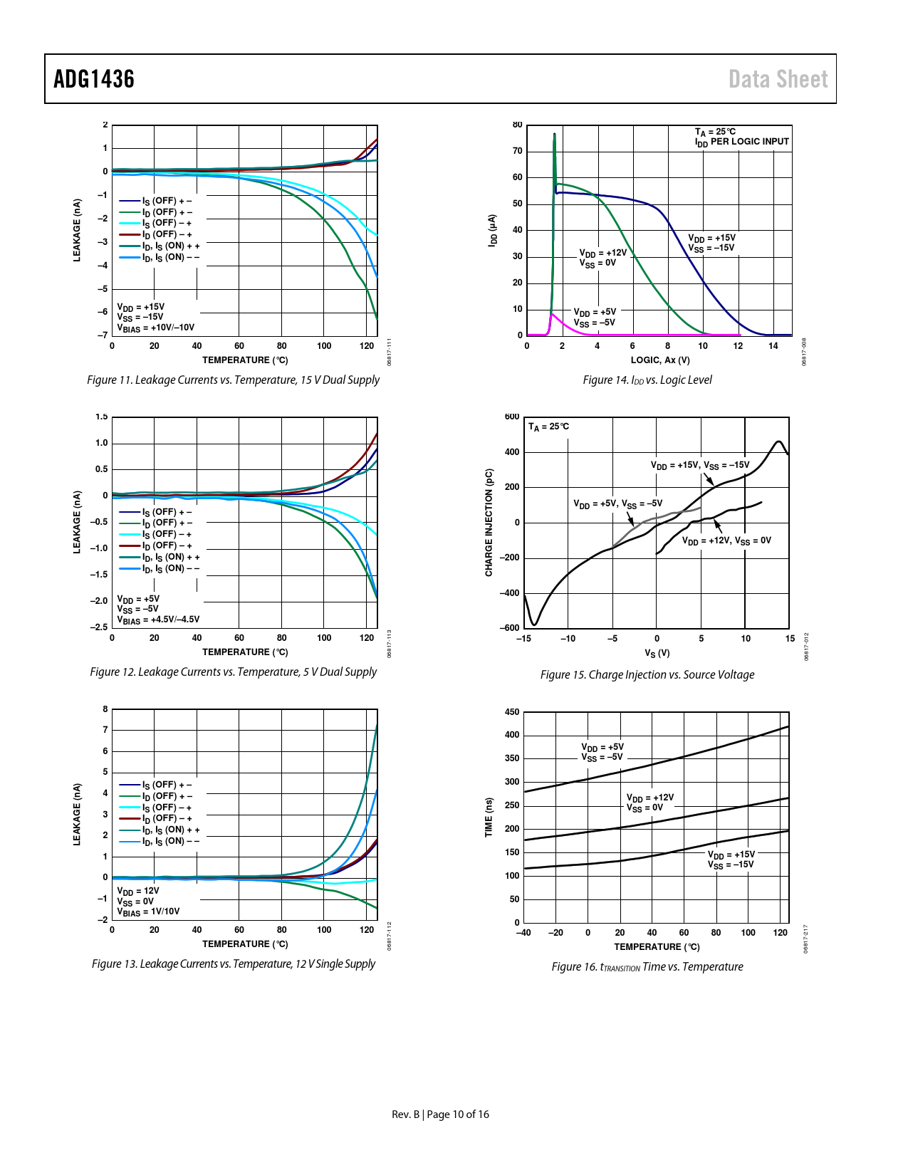 06817- Figure 13. Leakage Currents vs. Temperature, 12 V Single Supply Figure 16. tTRANSITION Time vs. Temperature Rev. B | Page 10 of 16 Document Outline Features Applications Functional Block Diagrams General Description Product Highlights Revision History Specifications 15 V Dual Supply 12 V Single Supply 5 V Dual Supply Continuous Current per Channel Absolute Maximum Ratings ESD Caution Pin Configurations and Function Descriptions Truth Table For Switches Typical Performance Characteristics Terminology Test Circuits Outline Dimensions Ordering Guide