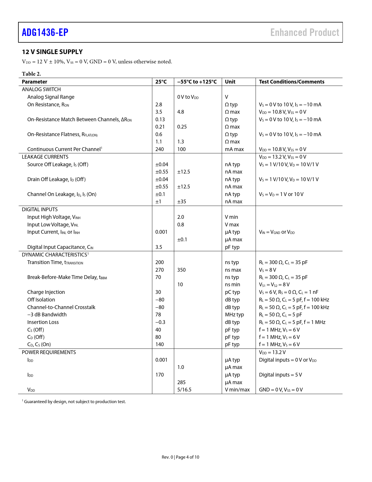 ADG1436-EP. Enhanced Product. 12 V SINGLE SUPPLY. Table 2. Parameter. 25°C. −55°C to +125°C. Unit. Test Conditions/Comments