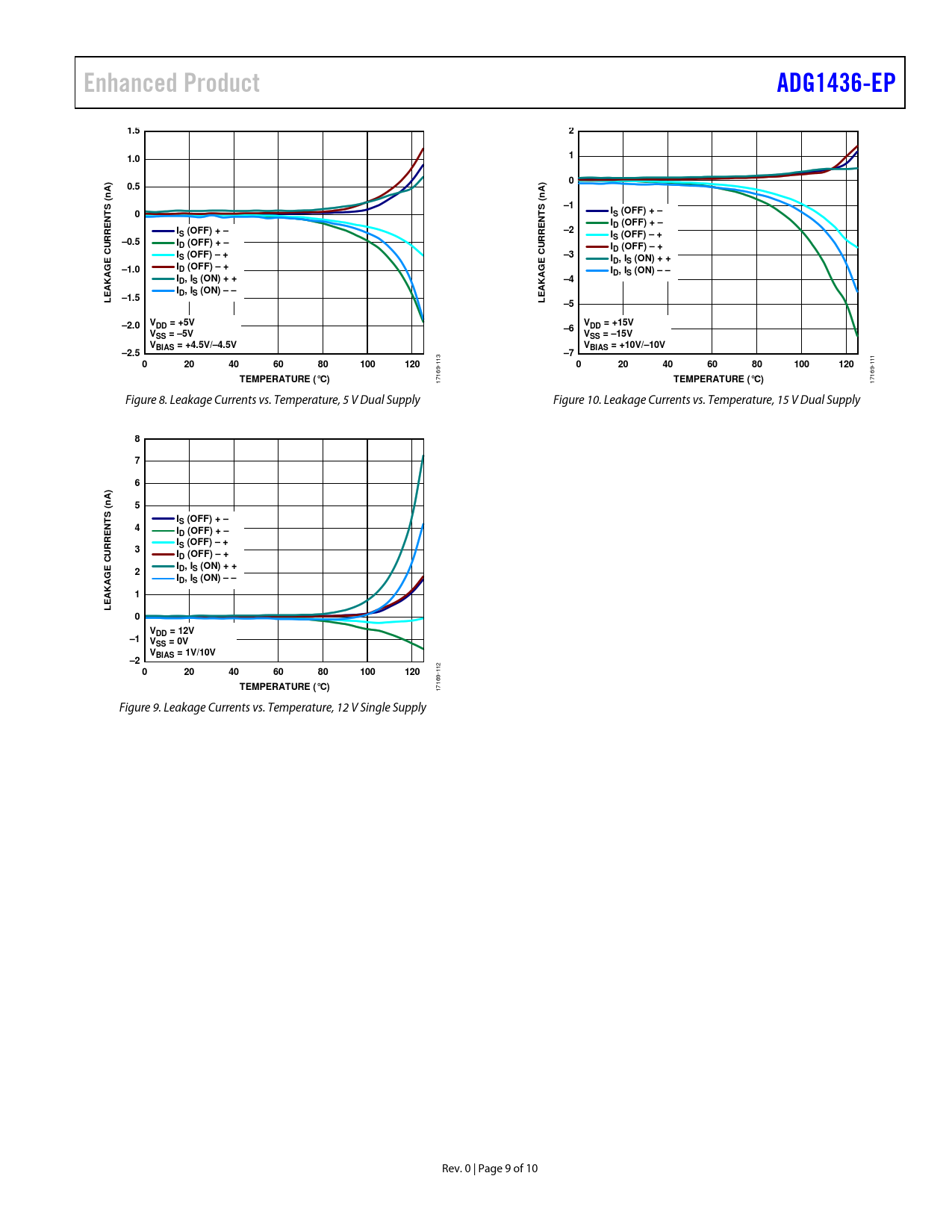 17169- Figure 8. Leakage Currents vs. Temperature, 5 V Dual Supply Figure 10. Leakage Currents vs. Temperature, 15 V Dual Supply