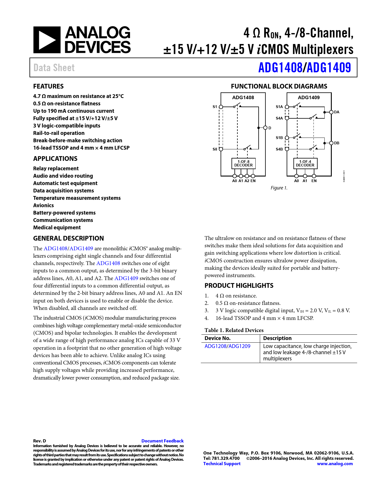 4 Ω RON, 4-/8-Channel,. ±15 V/+12 V/±5 V i. CMOS Multiplexers. Data Sheet. ADG1408/. ADG1409. FEATURES. FUNCTIONAL BLOCK DIAGRAMS