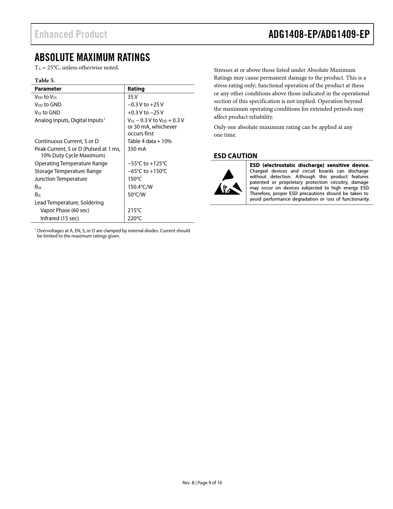 Enhanced Product. ADG1408-EP/ADG1409-EP. ABSOLUTE MAXIMUM RATINGS. Table 5. Parameter. Rating. ESD CAUTION