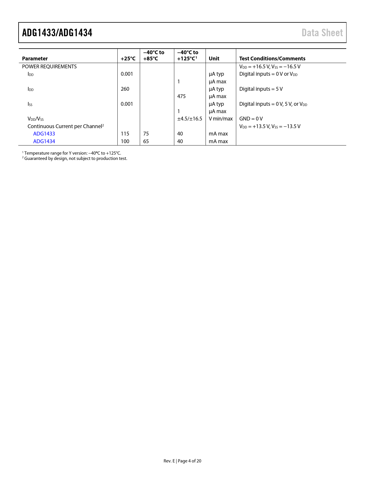 POWER REQUIREMENTS VDD = +16.5 V, VSS = −16.5 V IDD 0.001 µA typ Digital inputs = 0 V or VDD 1 µA max IDD 260 µA typ Digital inputs = 5 V 475 µA max ISS 0.001 µA typ Digital inputs = 0 V, 5 V, or VDD 1 µA max VDD/VSS ±4.5/±16.5 V min/max GND = 0 V Continuous Current per Channel2 VDD = +13.5 V, VSS = −13.5 V ADG1433 115 75 40 mA max ADG1434 100 65 40 mA max 1 Temperature range for Y version: −40