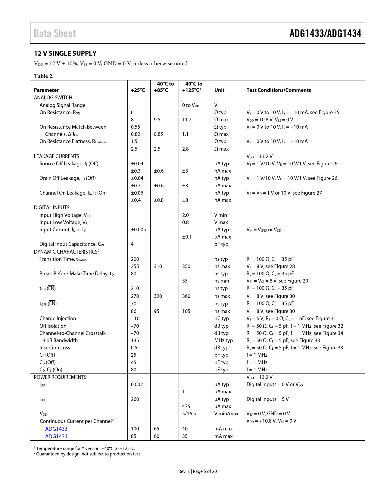 Data Sheet. ADG1433/ADG1434. 12 V SINGLE SUPPLY. Table 2. −40°C to. Parameter. +25°C. +85°C. +125°C1. Unit. Test Conditions/Comments