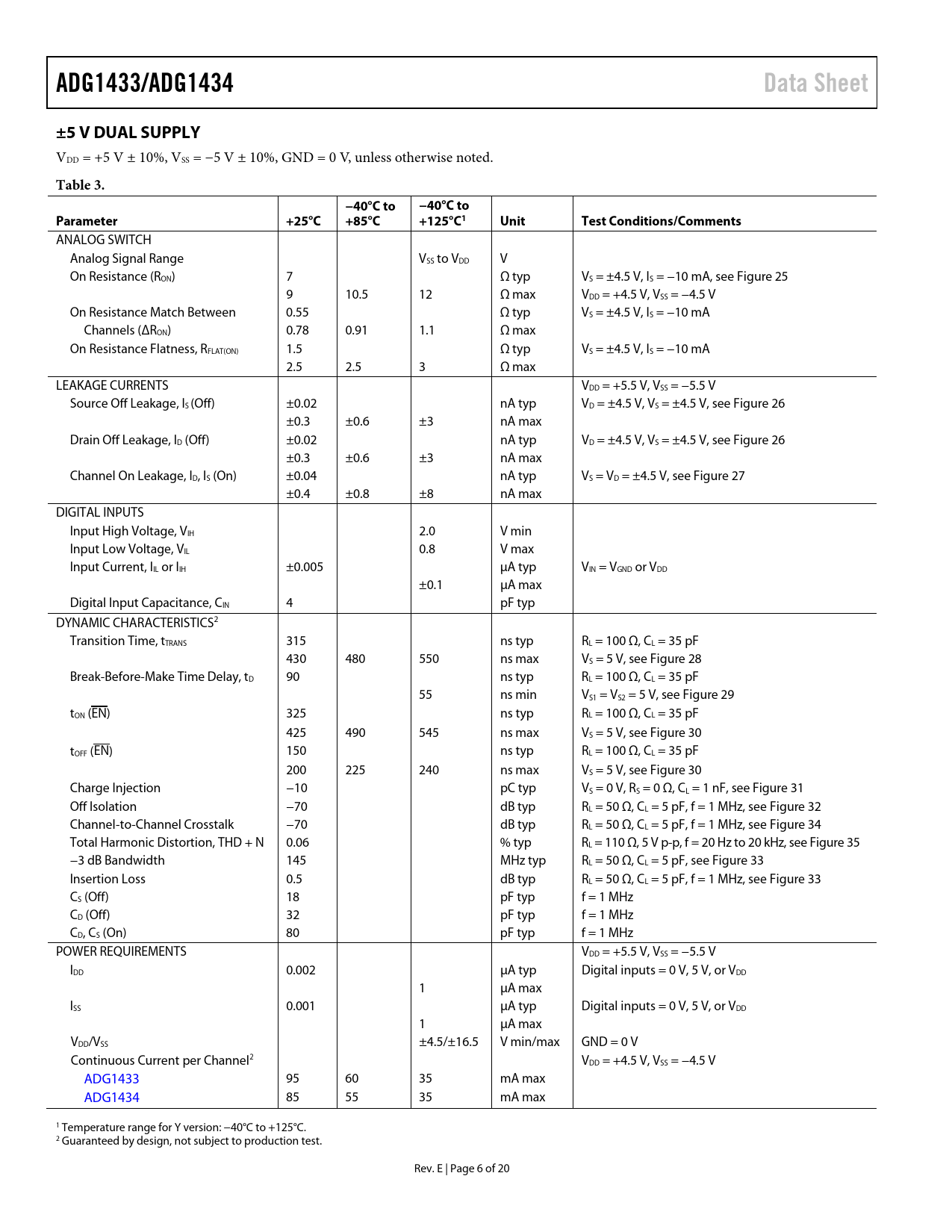 link to page 13 link to page 13 link to page 13 link to page 13 link to page 13 link to page 13 link to page 13 link to page 13 link to page 14 link to page 14 link to page 14 link to page 14 link to page 14 link to page 14 ADG1433/ADG1434Data Sheet±5 V DUAL SUPPLY VDD = +5 V ± 10%, VSS = −5 V ± 10%, GND = 0 V, unless otherwise noted. Table 3.−40°C to−40°C toParameter+25°C+85°C+125°C1UnitTest Conditions/Comments ANALOG SWITCH Analog Signal Range VSS to VDD V On Resistance (RON) 7 Ω typ VS = ±4.5 V, IS = −10 mA, see Figure 25 9 10.5 12 Ω max VDD = +4.5 V, VSS = −4.5 V On Resistance Match Between 0.55 Ω typ VS = ±4.5 V, IS = −10 mA Channels (ΔRON) 0.78 0.91 1.1 Ω max On Resistance Flatness, RFLAT(ON) 1.5 Ω typ VS = ±4.5 V, IS = −10 mA 2.5 2.5 3 Ω max LEAKAGE CURRENTS VDD = +5.5 V, VSS = −5.5 V Source Off Leakage, IS (Off) ±0.02 nA typ VD = ±4.5 V, VS = ±4.5 V, see Figure 26 ±0.3 ±0.6 ±3 nA max Drain Off Leakage, ID (Off) ±0.02 nA typ VD = ±4.5 V, VS = ±4.5 V, see Figure 26 ±0.3 ±0.6 ±3 nA max Channel On Leakage, ID, IS (On) ±0.04 nA typ VS = VD = ±4.5 V, see Figure 27 ±0.4 ±0.8 ±8 nA max DIGITAL INPUTS Input High Voltage, VIH 2.0 V min Input Low Voltage, VIL 0.8 V max Input Current, IIL or IIH ±0.005 µA typ VIN = VGND or VDD ±0.1 µA max Digital Input Capacitance, CIN 4 pF typ DYNAMIC CHARACTERISTICS2 Transition Time, tTRANS 315 ns typ RL = 100 Ω, CL = 35 pF 430 480 550 ns max VS = 5 V, see Figure 28 Break-Before-Make Time Delay, tD 90 ns typ RL = 100 Ω, CL = 35 pF 55 ns min VS1 = VS2 = 5 V, see Figure 29 tON (EN) 325 ns typ RL = 100 Ω, CL = 35 pF 425 490 545 ns max VS = 5 V, see Figure 30 tOFF (EN) 150 ns typ RL = 100 Ω, CL = 35 pF 200 225 240 ns max VS = 5 V, see Figure 30 Charge Injection −10 pC typ VS = 0 V, RS = 0 Ω, CL = 1 nF, see Figure 31 Off Isolation −70 dB typ RL = 50 Ω, CL = 5 pF, f = 1 MHz, see Figure 32 Channel-to-Channel Crosstalk −70 dB typ RL = 50 Ω, CL = 5 pF, f = 1 MHz, see Figure 34 Total Harmonic Distortion, THD + N 0.06 % typ RL = 110 Ω, 5 V p-p, f = 20 Hz to 20 kHz, see Figure 35 −3 dB Bandwidth 145 MHz typ RL = 50 Ω, CL = 5 pF, see Figure 33 Insertion Loss 0.5 dB typ RL = 50 Ω, CL = 5 pF, f = 1 MHz, see Figure 33 CS (Off) 18 pF typ f = 1 MHz CD (Off) 32 pF typ f = 1 MHz CD, CS (On) 80 pF typ f = 1 MHz POWER REQUIREMENTS VDD = +5.5 V, VSS = −5.5 V IDD 0.002 µA typ Digital inputs = 0 V, 5 V, or VDD 1 µA max ISS 0.001 µA typ Digital inputs = 0 V, 5 V, or VDD 1 µA max VDD/VSS ±4.5/±16.5 V min/max GND = 0 V Continuous Current per Channel2 VDD = +4.5 V, VSS = −4.5 V ADG1433 95 60 35 mA max ADG1434 85 55 35 mA max 1 Temperature range for Y version: −40°C to +125°C. 2 Guaranteed by design, not subject to production test. Rev. E | Page 6 of 20 Document Outline FEATURES APPLICATIONS GENERAL DESCRIPTION FUNCTIONAL BLOCK DIAGRAMS REVISION HISTORY SPECIFICATIONS ±15 V DUAL SUPPLY 12 V SINGLE SUPPLY ±5 V DUAL SUPPLY ABSOLUTE MAXIMUM RATINGS THERMAL RESISTANCE ESD CAUTION PIN CONFIGURATIONS AND FUNCTION DESCRIPTIONS TYPICAL PERFORMANCE CHARACTERISTICS TEST CIRCUITS TERMINOLOGY OUTLINE DIMENSIONS ORDERING GUIDE