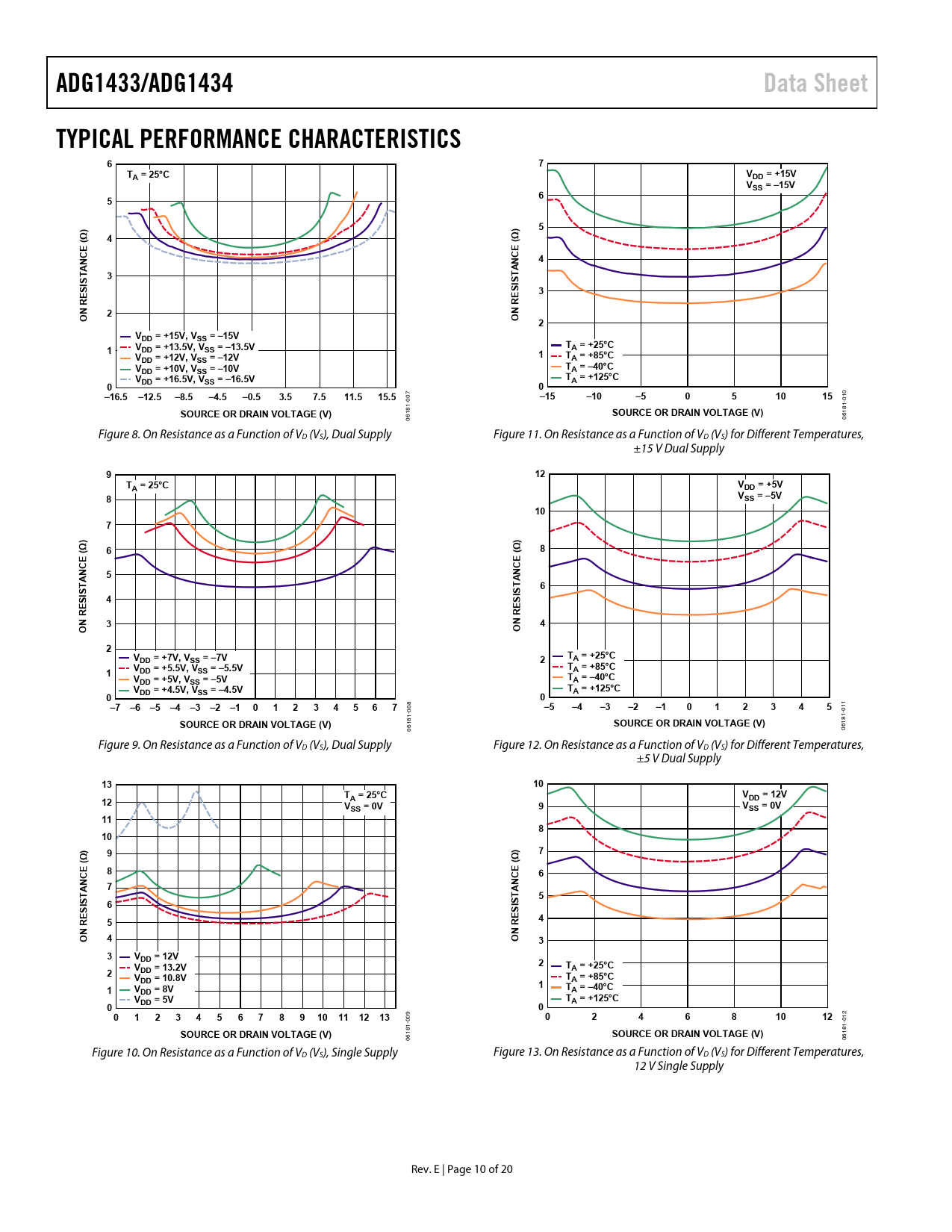 ADG1433/ADG1434Data SheetTYPICAL PERFORMANCE CHARACTERISTICS67TA = 25°CVDD = +15VVSS = –15V65))5Ω(Ω4(NCE4ANCEAT3TISISSS3N RE2N REOO2VDD = +15V, VSS = –15VT1VDD = +13.5V, VSS = –13.5VA = +25°CV1TDD = +12V, VSS = –12VA = +85°CVTDD = +10V, VSS = –10VA = –40°CVTDD = +16.5V, VSS = –16.5VA = +125°C00–16.5–12.5–8.5–4.5–0.53.57.511.515.5 7 –15–10–5051015 10 00 -0 1- 81 SOURCE OR DRAIN VOLTAGE (V) 18 SOURCE OR DRAIN VOLTAGE (V) 06 061 Figure 8. On Resistance as a Function of VD (VS), Dual Supply Figure 11. On Resistance as a Function of VD (VS) for Different Temperatures, ±15 V Dual Supply 912TA = 25°CVDD = +5V8VSS = –5V107))6Ω(Ω(85NCEANCEATT6ISISS4SN RE3N RE4OO2VTDD = +7V, VSS = –7V2A = +25°CVT1DD = +5.5V, VSS = –5.5VA = +85°CVTDD = +5V, VSS = –5VA = –40°CVTDD = +4.5V, VSS = –4.5VA = +125°C00–7 –6 –5 –4 –3 –2 –101234567 8 –5–4–3–2–1012345 11 00 -0 1- 81 SOURCE OR DRAIN VOLTAGE (V) 18 SOURCE OR DRAIN VOLTAGE (V) 06 061 Figure 9. On Resistance as a Function of VD (VS), Dual Supply Figure 12. On Resistance as a Function of VD (VS) for Different Temperatures, ±5 V Dual Supply 1310TV12A = 25°CDD = 12VVSS = 0V9VSS = 0V11810))7Ω9Ω((86NCENCEA7ATT5ISISS6S54N REN REO4O33VDD = 12VV2T2DD = 13.2VA = +25°CVTDD = 10.8VA = +85°C11VTDD = 8VA = –40°CVTA = +125°C0DD = 5V001234567891011 12 13 09 024681012 12 -0 -0 81 81 SOURCE OR DRAIN VOLTAGE (V)SOURCE OR DRAIN VOLTAGE (V) 061 061 Figure 10. On Resistance as a Function of VD (VS), Single Supply Figure 13. On Resistance as a Function of VD (VS) for Different Temperatures, 12 V Single Supply Rev. E | Page 10 of 20 Document Outline FEATURES APPLICATIONS GENERAL DESCRIPTION FUNCTIONAL BLOCK DIAGRAMS REVISION HISTORY SPECIFICATIONS ±15 V DUAL SUPPLY 12 V SINGLE SUPPLY ±5 V DUAL SUPPLY ABSOLUTE MAXIMUM RATINGS THERMAL RESISTANCE ESD CAUTION PIN CONFIGURATIONS AND FUNCTION DESCRIPTIONS TYPICAL PERFORMANCE CHARACTERISTICS TEST CIRCUITS TERMINOLOGY OUTLINE DIMENSIONS ORDERING GUIDE