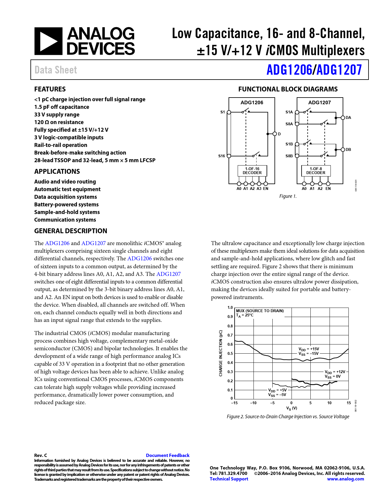 Low Capacitance, 16- and 8-Channel,. ±15 V/+12 V i. CMOS Multiplexers. Data Sheet. ADG1206. /ADG1207. FEATURES
