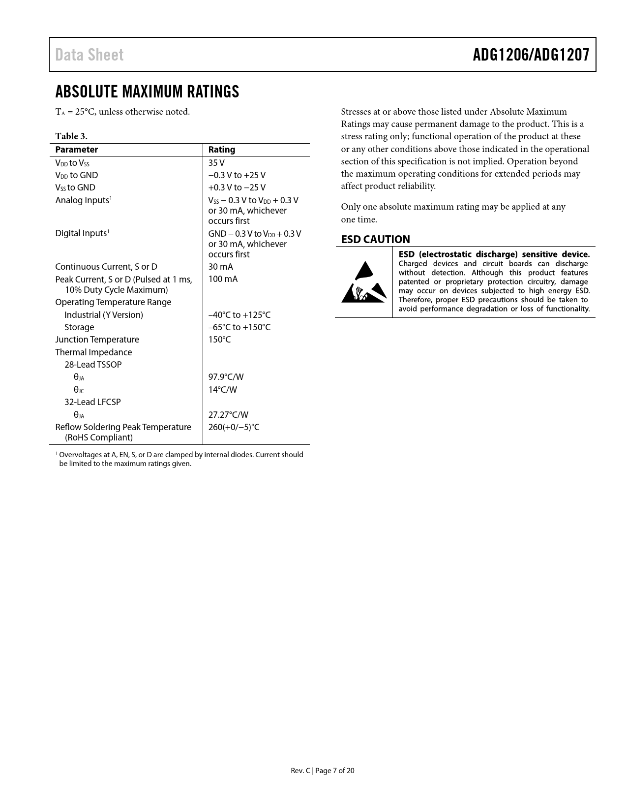 Data SheetADG1206/ADG1207ABSOLUTE MAXIMUM RATINGS TA = 25°C, unless otherwise noted. Stresses at or above those listed under Absolute Maximum Ratings may cause permanent damage to the product. This is a Table 3. stress rating only; functional operation of the product at these Parameter Rating or any other conditions above those indicated in the operational VDD to VSS 35 V section of this specification is not implied. Operation beyond VDD to GND −0.3 V to +25 V the maximum operating conditions for extended periods may V affect product reliability. SS to GND +0.3 V to −25 V Analog Inputs1 VSS − 0.3 V to VDD + 0.3 V or 30 mA, whichever Only one absolute maximum rating may be applied at any occurs first one time. Digital Inputs1 GND − 0.3 V to VDD + 0.3 V ESD CAUTION or 30 mA, whichever occurs first Continuous Current, S or D 30 mA Peak Current, S or D (Pulsed at 1 ms, 100 mA 10% Duty Cycle Maximum) Operating Temperature Range Industrial (Y Version) –40°C to +125°C Storage –65°C to +150°C Junction Temperature 150°C Thermal Impedance 28-Lead TSSOP θJA 97.9°C/W θJC 14°C/W 32-Lead LFCSP θJA 27.27°C/W Reflow Soldering Peak Temperature 260(+0/−5)°C (RoHS Compliant) 1 Overvoltages at A, EN, S, or D are clamped by internal diodes. Current should be limited to the maximum ratings given. Rev. C | Page 7 of 20 Document Outline FEATURES APPLICATIONS FUNCTIONAL BLOCK DIAGRAMS GENERAL DESCRIPTION TABLE OF CONTENTS REVISION HISTORY SPECIFICATIONS DUAL SUPPLY SINGLE SUPPLY ABSOLUTE MAXIMUM RATINGS ESD CAUTION PIN CONFIGURATIONS AND FUNCTION DESCRIPTIONS TYPICAL PERFORMANCE CHARACTERISTICS TERMINOLOGY TEST CIRCUITS OUTLINE DIMENSIONS ORDERING GUIDE