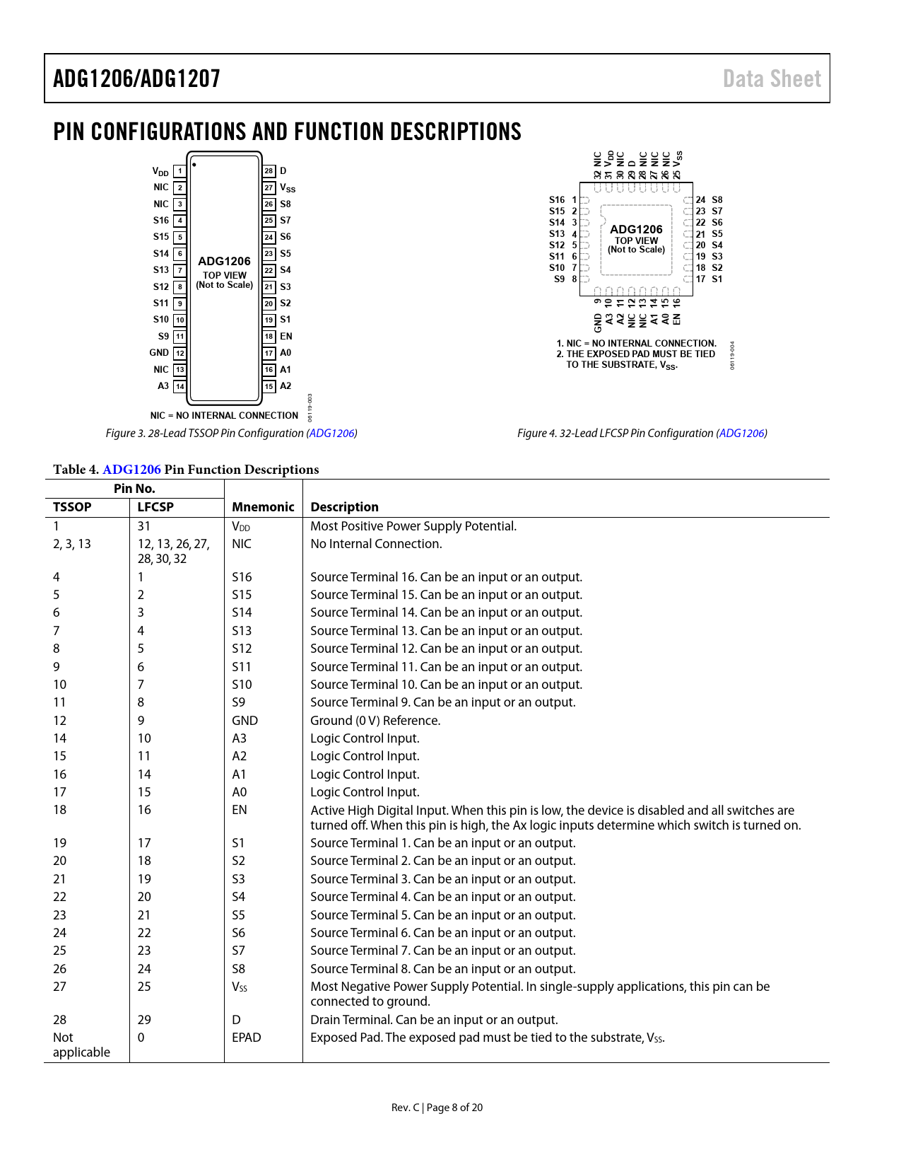Pages / Page20 / 8 — ADG1206/ADG1207. Data Sheet. PIN CONFIGURATIONS AND FUNCTION …
