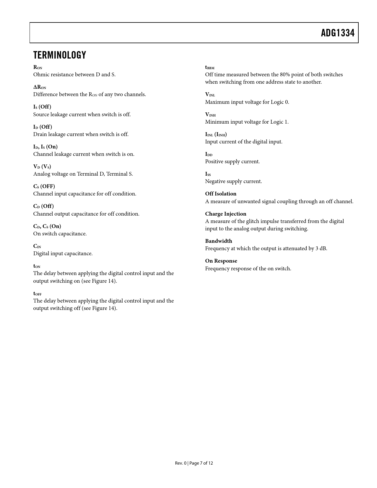 link to page 10 link to page 10 ADG1334TERMINOLOGY RONtBBM Ohmic resistance between D and S. Off time measured between the 80% point of both switches when switching from one address state to another. ΔRON Difference between the RON of any two channels. VINL Maximum input voltage for Logic 0. IS (Off) Source leakage current when switch is off. VINH Minimum input voltage for Logic 1. ID (Off) Drain leakage current when switch is off. IINL (IINH) Input current of the digital input. ID, IS (On) Channel leakage current when switch is on. IDD Positive supply current. VD (VS) Analog voltage on Terminal D, Terminal S. ISS Negative supply current. CS (OFF) Channel input capacitance for off condition. Off Isolation A measure of unwanted signal coupling through an off channel. CD (Off) Channel output capacitance for off condition. Charge Injection A measure of the glitch impulse transferred from the digital CD, CS (On) input to the analog output during switching. On switch capacitance. BandwidthCIN Frequency at which the output is attenuated by 3 dB. Digital input capacitance. On ResponsetON Frequency response of the on switch. The delay between applying the digital control input and the output switching on (see Figure 14). tOFF The delay between applying the digital control input and the output switching off (see Figure 14). Rev. 0 | Page 7 of 12 Document Outline FEATURES APPLICATIONS FUNCTIONAL BLOCK DIAGRAM GENERAL DESCRIPTION PRODUCT HIGHLIGHTS TABLE OF CONTENTS REVISION HISTORY SPECIFICATIONS DUAL SUPPLY SINGLE SUPPLY ABSOLUTE MAXIMUM RATINGS ESD CAUTION PIN CONFIGURATION AND FUNCTION DESCRIPTIONS TERMINOLOGY TYPICAL PERFORMANCE CHARACTERISTICS TEST CIRCUITS OUTLINE DIMENSIONS ORDERING GUIDE