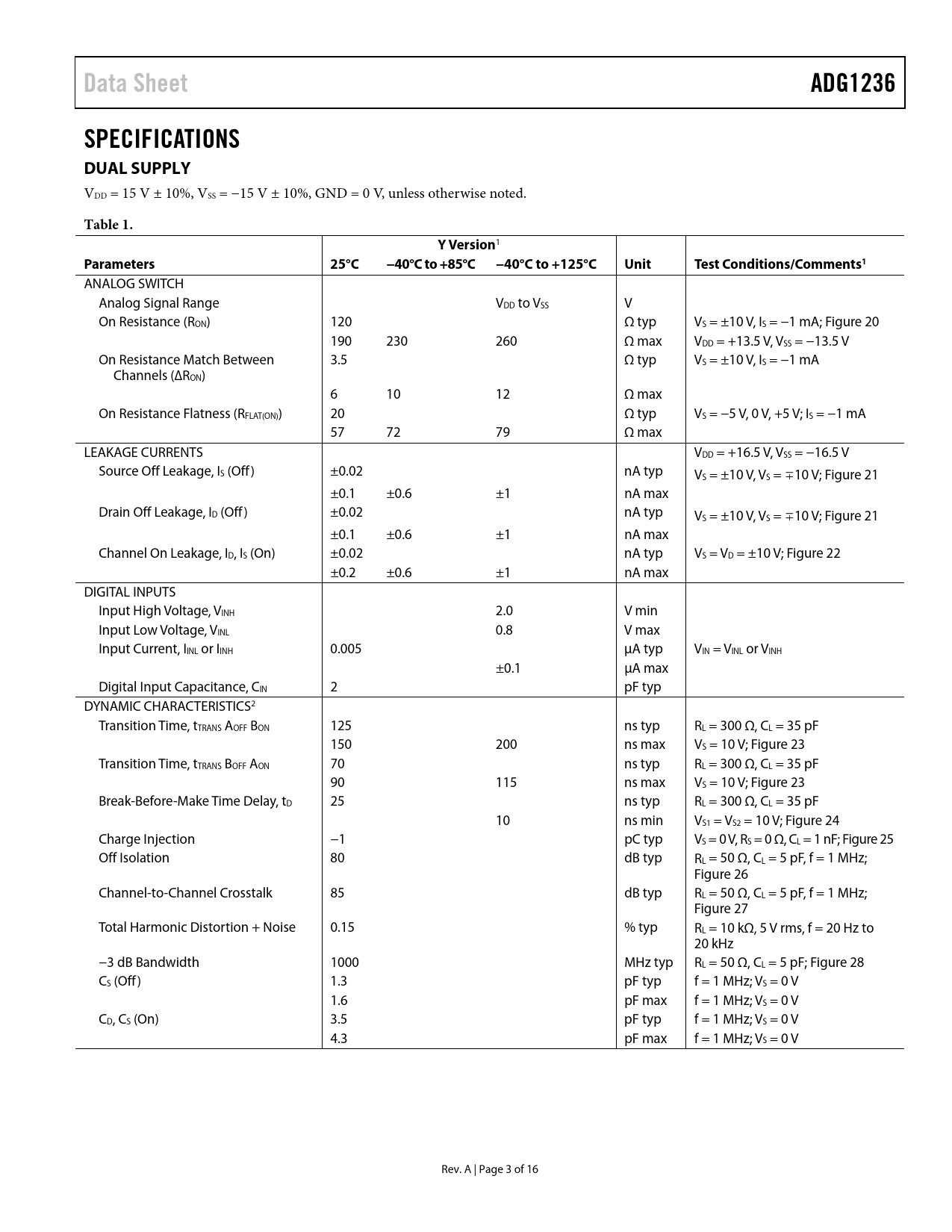 Pages / Page16 / 3 — Data Sheet. ADG1236. SPECIFICATIONS DUAL SUPPLY. Table 1. Y. Version. …