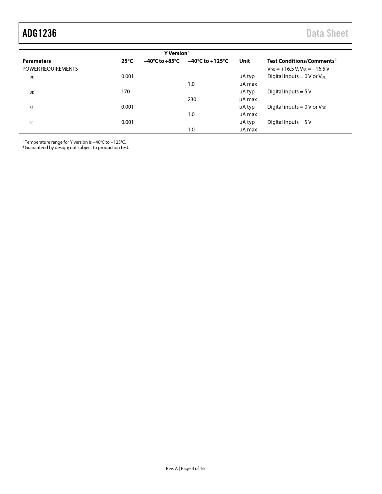 ADG1236. Data Sheet. Y Version. Parameters. 25°C. −40°C to +85°C. −40°C to +125°C. Unit. Test Conditions/Comments1