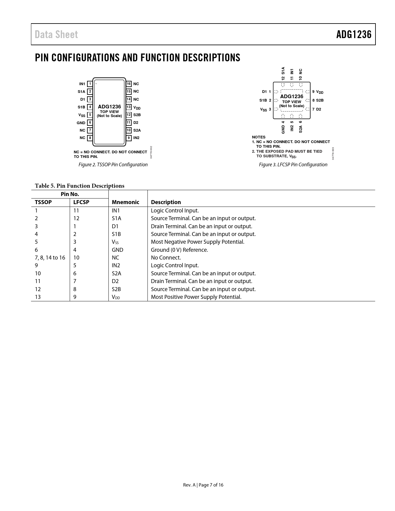 Data SheetADG1236PIN CONFIGURATIONS AND FUNCTION DESCRIPTIONSA 11CSNIN210111IN1116 NCS1A215 NCD1 19 VDDADG1236D1314 NCS1B 28 S2BTOP VIEWS1B4ADG123613 V(Not to Scale)DDV37 D2TOP VIEWSSVSS 512 S2B(Not to Scale)GND611D2456D2ANC710 S2ANNI2GSNC89IN2NOTES 1. NC = NO CONNECT. DO NOT CONNECT 2 TO THIS PIN. 00 03 6- NC = NO CONNECT. DO NOT CONNECT2. THE EXPOSED PAD MUST BE TIED 0 76- 477 TO THIS PIN.TO SUBSTRATE, V 0 SS. 047 Figure 2. TSSOP Pin Configuration Figure 3. LFCSP Pin Configuration Table 5. Pin Function DescriptionsPin No.TSSOP LFCSP MnemonicDescription 1 11 IN1 Logic Control Input. 2 12 S1A Source Terminal. Can be an input or output. 3 1 D1 Drain Terminal. Can be an input or output. 4 2 S1B Source Terminal. Can be an input or output. 5 3 VSS Most Negative Power Supply Potential. 6 4 GND Ground (0 V) Reference. 7, 8, 14 to 16 10 NC No Connect. 9 5 IN2 Logic Control Input. 10 6 S2A Source Terminal. Can be an input or output. 11 7 D2 Drain Terminal. Can be an input or output. 12 8 S2B Source Terminal. Can be an input or output. 13 9 VDD Most Positive Power Supply Potential. Rev. A | Page 7 of 16 Document Outline FEATURES APPLICATIONS FUNCTIONAL BLOCK DIAGRAM GENERAL DESCRIPTION PRODUCT HIGHLIGHTS REVISION HISTORY SPECIFICATIONS DUAL SUPPLY SINGLE SUPPLY ABSOLUTE MAXIMUM RATINGS ESD CAUTION TRUTH TABLE FOR SWITCHES PIN CONFIGURATIONS AND FUNCTION DESCRIPTIONS TERMINOLOGY TYPICAL PERFORMANCE CHARACTERISTICS TEST CIRCUITS OUTLINE DIMENSIONS ORDERING GUIDE