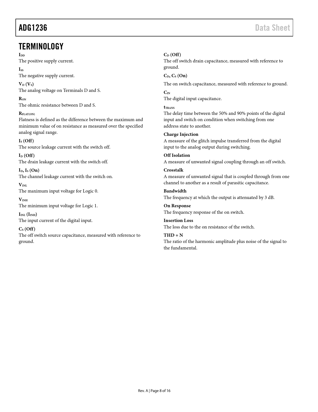 Pages / Page16 / 8 — ADG1236. Data Sheet. TERMINOLOGY IDD. CD (Off). CD, CS (On). VD (VS). …