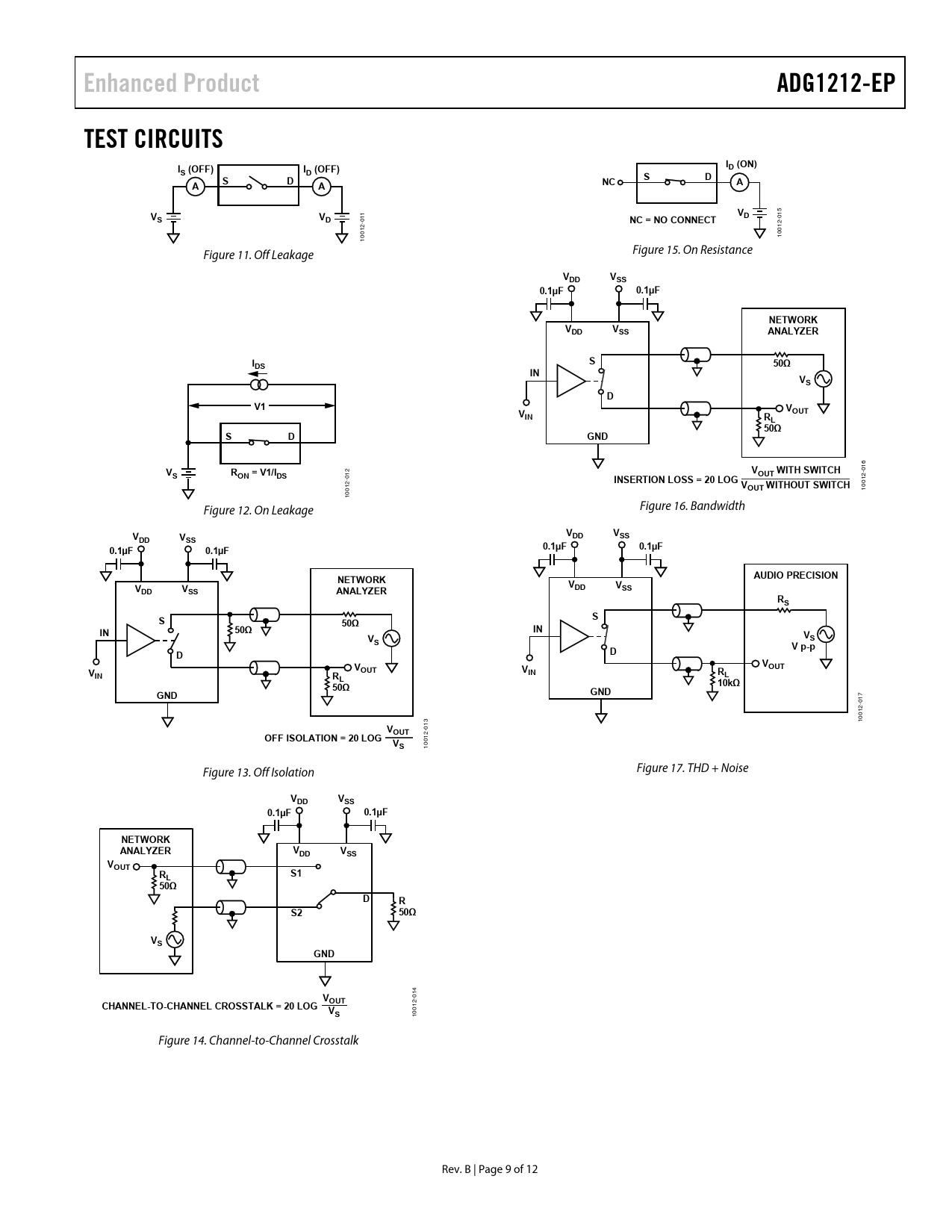 Enhanced Product. ADG1212-EP. TEST CIRCUITS. D (ON). S (OFF). ID (OFF). NC = NO CONNECT. VDD. VSS. 0.1µF. NETWORK. ANALYZER. 50Ω. VOUT. VIN. GND
