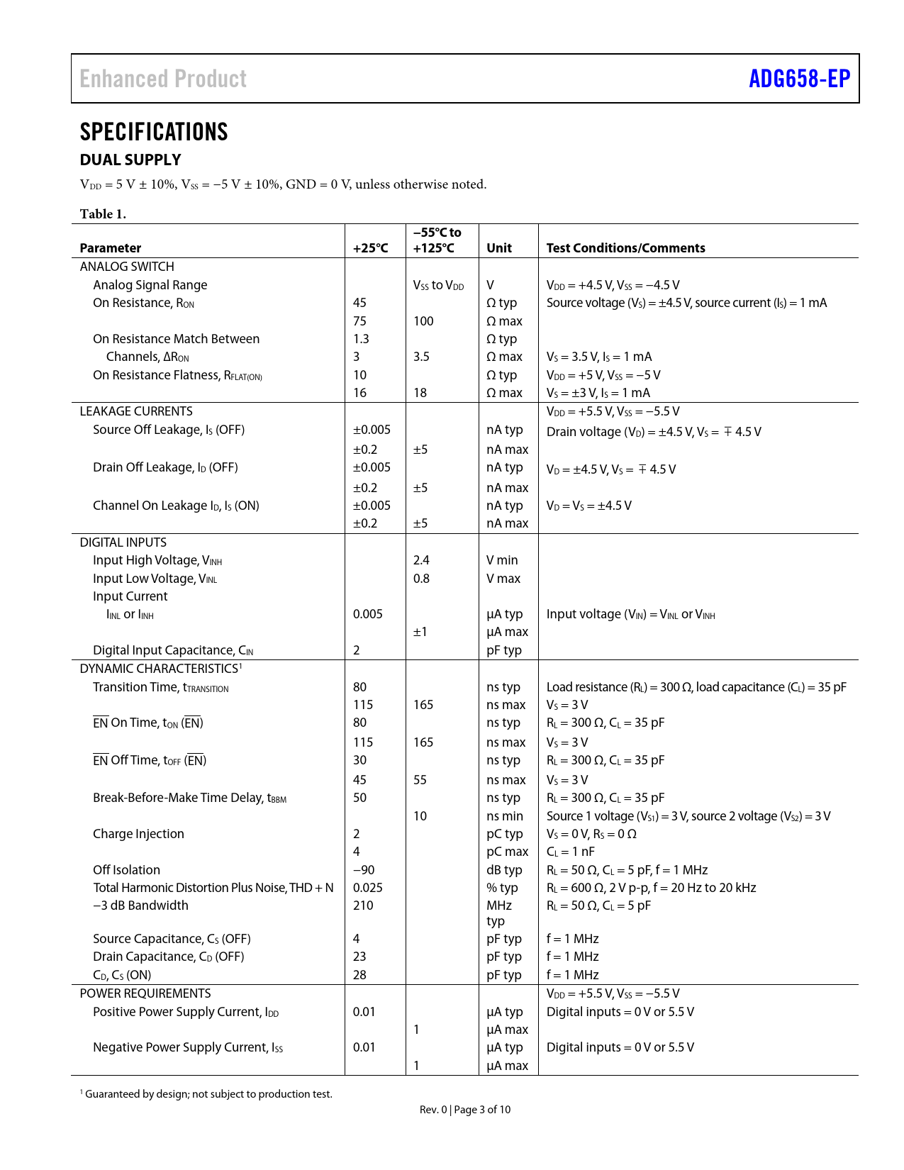 Enhanced Product. ADG658-EP. SPECIFICATIONS DUAL SUPPLY. Table 1. −55°C to. Parameter. +25°C. +125°C. Unit. Test Conditions/Comments