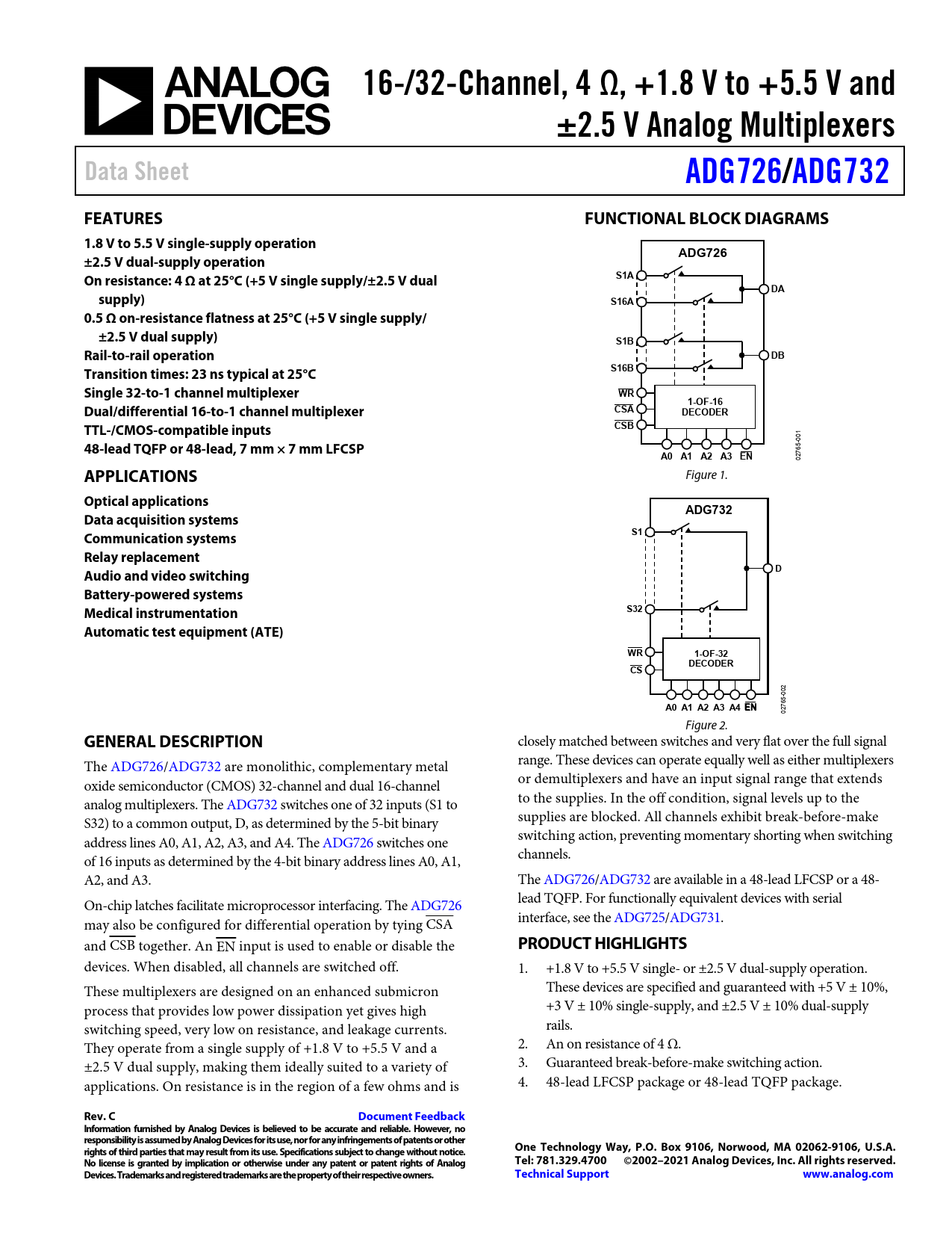 16-/32-Channel, 4 Ω, +1.8 V to +5.5 V and. ±2.5 V Analog Multiplexers. Data Sheet. ADG726. /ADG732. FEATURES