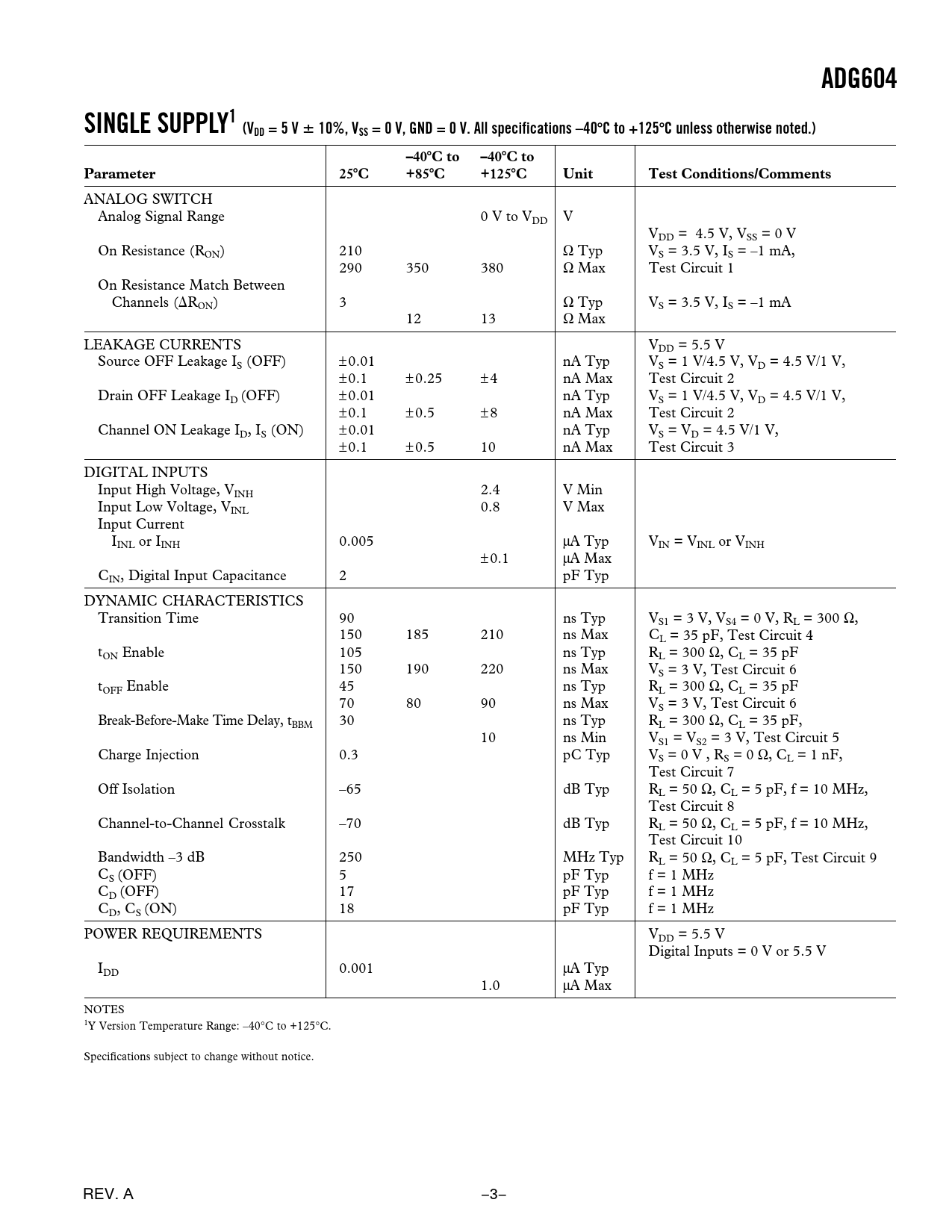 ADG604 SINGLE SUPPLY1 (VDD = 5 V 10%, VSS = 0 V, GND = 0 V All specifications –40 C to +125 C unless otherwise noted.) –40