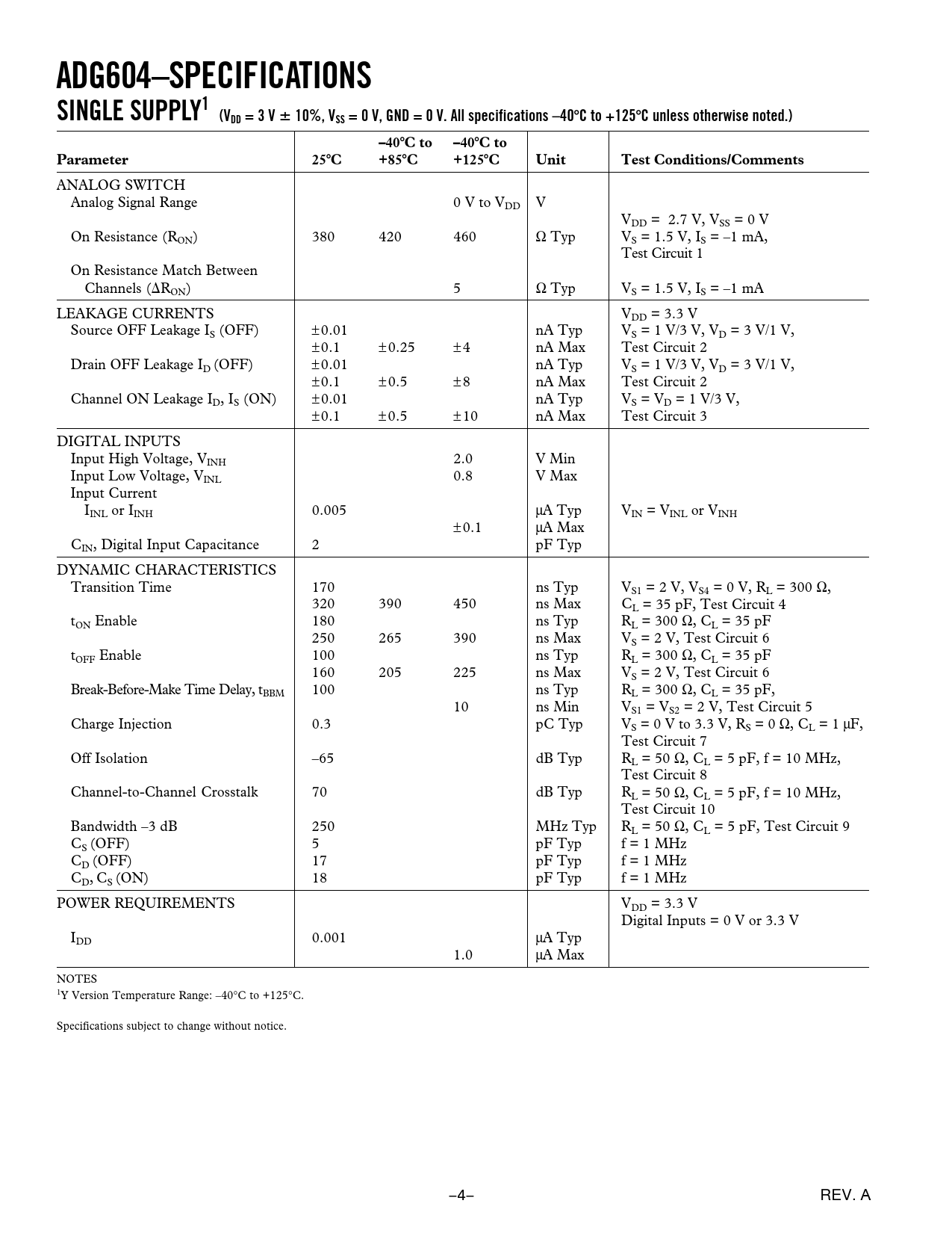 ADG604–SPECIFICATIONSSINGLE SUPPLY1 (VDD = 3 V10%, VSS = 0 V, GND = 0 V. All specifications –40C to +125C unless otherwise noted.)–40C to–40C toParameter25C+85C+125CUnitTest Conditions/Comments ANALOG SWITCH Analog Signal Range 0 V to VDD V VDD = 2.7 V, VSS = 0 V On Resistance (RON) 380 420 460 Ω Typ VS = 1.5 V, IS = –1 mA, Test Circuit 1 On Resistance Match Between Channels (⌬RON) 5 Ω Typ VS = 1.5 V, IS = –1 mA LEAKAGE CURRENTS VDD = 3.3 V Source OFF Leakage IS (OFF) ±0.01 nA Typ VS = 1 V/3 V, VD = 3 V/1 V, ±0.1 ±0.25 ±4 nA Max Test Circuit 2 Drain OFF Leakage ID (OFF) ±0.01 nA Typ VS = 1 V/3 V, VD = 3 V/1 V, ±0.1 ±0.5 ±8 nA Max Test Circuit 2 Channel ON Leakage ID, IS (ON) ±0.01 nA Typ VS = VD = 1 V/3 V, ±0.1 ±0.5 ±10 nA Max Test Circuit 3 DIGITAL INPUTS Input High Voltage, VINH 2.0 V Min Input Low Voltage, VINL 0.8 V Max Input Current IINL or IINH 0.005 µA Typ VIN = VINL or VINH ±0.1 µA Max CIN, Digital Input Capacitance 2 pF Typ DYNAMIC CHARACTERISTICS Transition Time 170 ns Typ VS1 = 2 V, VS4 = 0 V, RL = 300 Ω, 320 390 450 ns Max CL = 35 pF, Test Circuit 4 tON Enable 180 ns Typ RL = 300 Ω, CL = 35 pF 250 265 390 ns Max VS = 2 V, Test Circuit 6 tOFF Enable 100 ns Typ RL = 300 Ω, CL = 35 pF 160 205 225 ns Max VS = 2 V, Test Circuit 6 Break-Before-Make Time Delay, tBBM 100 ns Typ RL = 300 Ω, CL = 35 pF, 10 ns Min VS1 = VS2 = 2 V, Test Circuit 5 Charge Injection 0.3 pC Typ VS = 0 V to 3.3 V, RS = 0 Ω, CL = 1 µF, Test Circuit 7 Off Isolation –65 dB Typ RL = 50 Ω, CL = 5 pF, f = 10 MHz, Test Circuit 8 Channel-to-Channel Crosstalk 70 dB Typ RL = 50 Ω, CL = 5 pF, f = 10 MHz, Test Circuit 10 Bandwidth –3 dB 250 MHz Typ RL = 50 Ω, CL = 5 pF, Test Circuit 9 CS (OFF) 5 pF Typ f = 1 MHz CD (OFF) 17 pF Typ f = 1 MHz CD, CS (ON) 18 pF Typ f = 1 MHz POWER REQUIREMENTS VDD = 3.3 V Digital Inputs = 0 V or 3.3 V IDD 0.001 µA Typ 1.0 µA Max NOTES 1Y Version Temperature Range: –40°C to +125°C. Specifications subject to change without notice. –4– REV. A