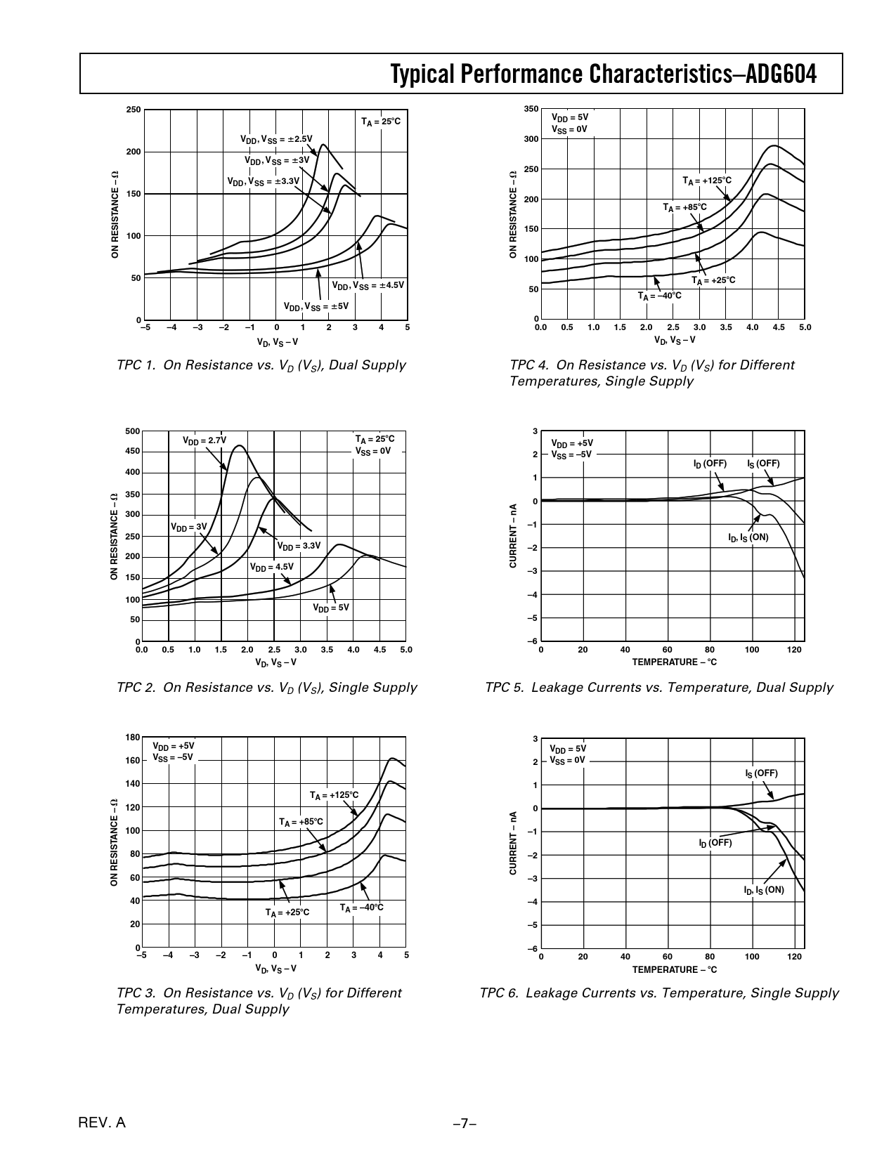 TPC 3. On Resistance vs. VD (VS) for Different TPC 6. Leakage Currents vs. Temperature, Single Supply Temperatures, Dual Supply REV. A –7–