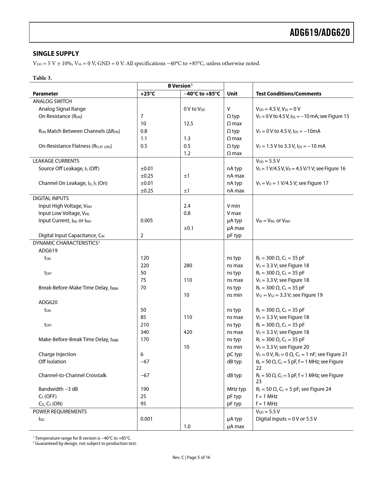 ADG619/ADG620. SINGLE SUPPLY. Table 3. B. Version1. Parameter +25°C. 40°C to +85°C. Unit. Test Conditions/Comments