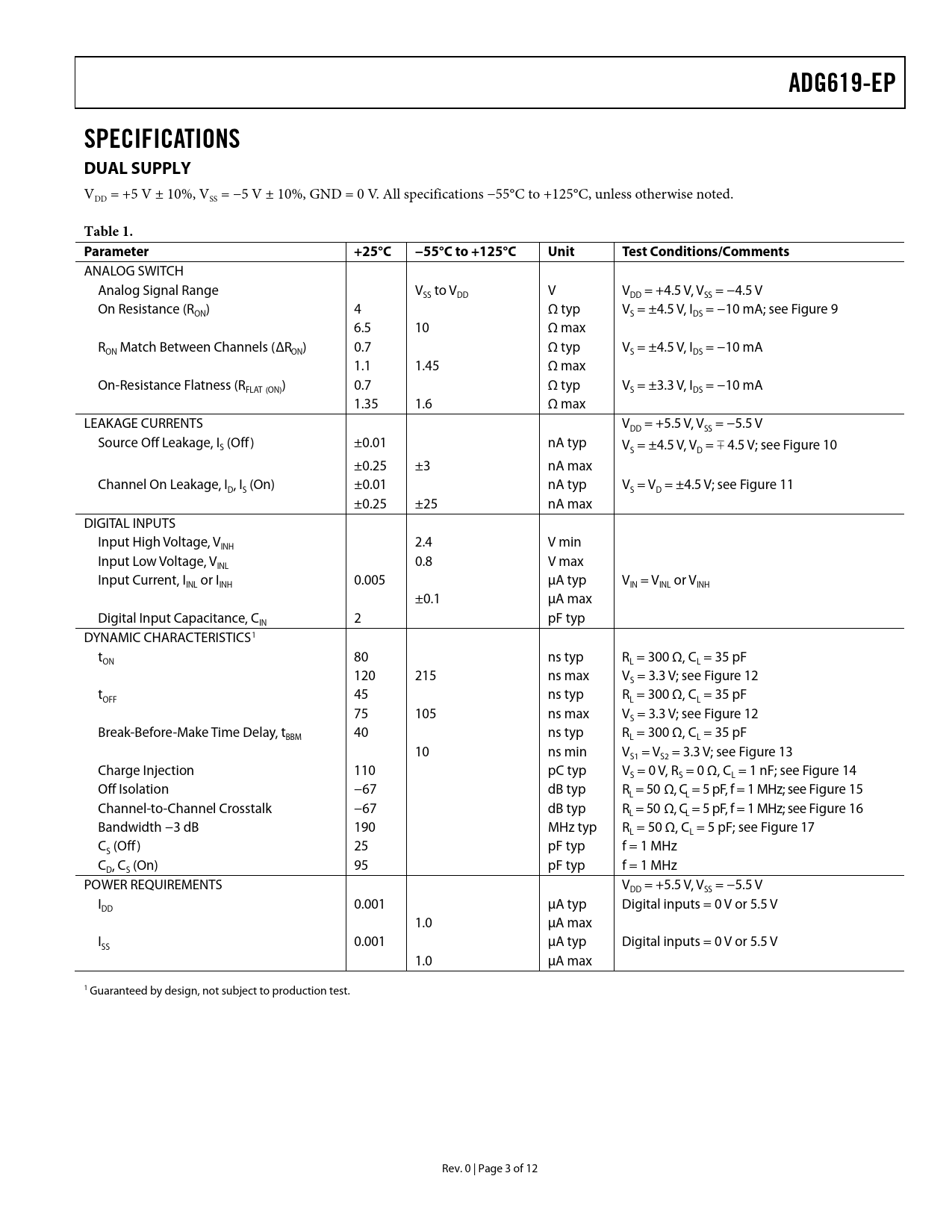 link to page 8 link to page 8 link to page 8 link to page 8 link to page 8 link to page 8 link to page 8 link to page 8 link to page 9 link to page 9 link to page 3 ADG619-EPSPECIFICATIONS DUAL SUPPLY VDD = +5 V ± 10%, VSS = −5 V ± 10%, GND = 0 V. All specifications −55°C to +125°C, unless otherwise noted. Table 1. Parameter+25°C−55°C to +125°CUnitTest Conditions/Comments ANALOG SWITCH Analog Signal Range V to V V V = +4.5 V, V = −4.5 V SS DD DD SS On Resistance (R ) 4 Ω typ V = ±4.5 V, I = −10 mA; see Figure 9 ON S DS 6.5 10 Ω max R Match Between Channels (ΔR ) 0.7 Ω typ V = ±4.5 V, I = −10 mA ON ON S DS 1.1 1.45 Ω max On-Resistance Flatness (R ) 0.7 Ω typ V = ±3.3 V, I = −10 mA FLAT (ON) S DS 1.35 1.6 Ω max LEAKAGE CURRENTS V = +5.5 V, V = −5.5 V DD SS Source Off Leakage, I (Off) ±0.01 nA typ S V = ±4.5 V, V = ∓ 4.5 V; see Figure 10 S D ±0.25 ±3 nA max Channel On Leakage, I , I (On) ±0.01 nA typ V = V = ±4.5 V; see Figure 11 D S S D ±0.25 ±25 nA max DIGITAL INPUTS Input High Voltage, V 2.4 V min INH Input Low Voltage, V 0.8 V max INL Input Current, I or I 0.005 µA typ V = V or V INL INH IN INL INH ±0.1 μA max Digital Input Capacitance, C 2 pF typ IN DYNAMIC CHARACTERISTICS1 t 80 ns typ R = 300 Ω, C = 35 pF ON L L 120 215 ns max V = 3.3 V; see Figure 12 S t 45 ns typ R = 300 Ω, C = 35 pF OFF L L 75 105 ns max V = 3.3 V; see Figure 12 S Break-Before-Make Time Delay, t 40 ns typ R = 300 Ω, C = 35 pF BBM L L 10 ns min V = V = 3.3 V; see Figure 13 S1 S2 Charge Injection 110 pC typ V = 0 V, R = 0 Ω, C = 1 nF; see Figure 14 S S L Off Isolation −67 dB typ R = 50 Ω, C = 5 pF, f = 1 MHz; see Figure 15 L L Channel-to-Channel Crosstalk −67 dB typ R = 50 Ω, C = 5 pF, f = 1 MHz; see Figure 16 L L Bandwidth −3 dB 190 MHz typ R = 50 Ω, C = 5 pF; see Figure 17 L L C (Off) 25 pF typ f = 1 MHz S C , C (On) 95 pF typ f = 1 MHz D S POWER REQUIREMENTS V = +5.5 V, V = −5.5 V DD SS I 0.001 μA typ Digital inputs = 0 V or 5.5 V DD 1.0 μA max I 0.001 μA typ Digital inputs = 0 V or 5.5 V SS 1.0 μA max 1 Guaranteed by design, not subject to production test. Rev. 0 | Page 3 of 12 Document Outline Features Applications Functional Block Diagram General Description Product Highlights Revision History Specifications Dual Supply Single Supply Absolute Maximum Ratings ESD Caution Pin Configuration and Function Descriptions Typical Performance Characteristics Test Circuits Outline Dimensions Ordering Guide