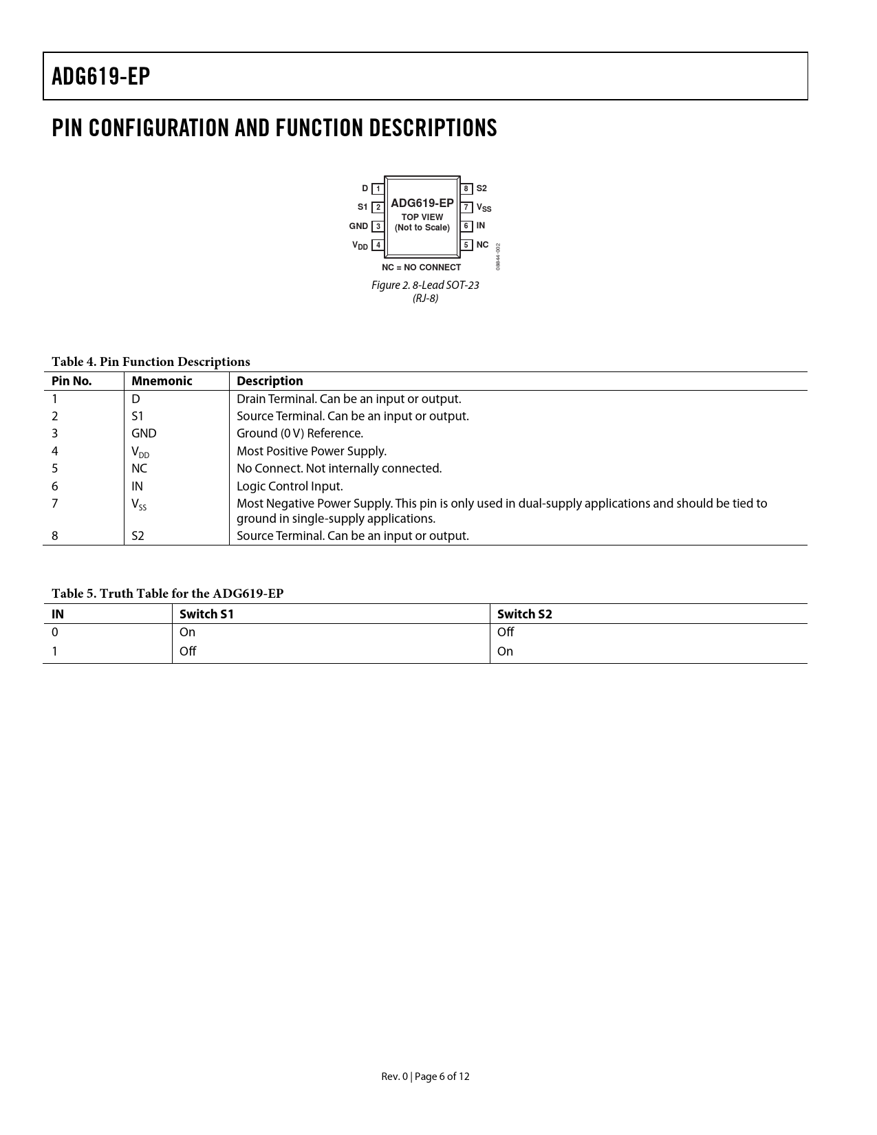 ADG619-EPPIN CONFIGURATION AND FUNCTION DESCRIPTIONSD18S2S1ADG619-EP27VSSTOP VIEWGND36(Not to Scale)INVDD 45NC 002 NC = NO CONNECT 08844- Figure 2. 8-Lead SOT-23 (RJ-8) Table 4. Pin Function Descriptions Pin No.MnemonicDescription 1 D Drain Terminal. Can be an input or output. 2 S1 Source Terminal. Can be an input or output. 3 GND Ground (0 V) Reference. 4 V Most Positive Power Supply. DD 5 NC No Connect. Not internally connected. 6 IN Logic Control Input. 7 V Most Negative Power Supply. This pin is only used in dual-supply applications and should be tied to SS ground in single-supply applications. 8 S2 Source Terminal. Can be an input or output. Table 5. Truth Table for the ADG619-EP INSwitch S1Switch S2 0 On Off 1 Off On Rev. 0 | Page 6 of 12 Document Outline Features Applications Functional Block Diagram General Description Product Highlights Revision History Specifications Dual Supply Single Supply Absolute Maximum Ratings ESD Caution Pin Configuration and Function Descriptions Typical Performance Characteristics Test Circuits Outline Dimensions Ordering Guide