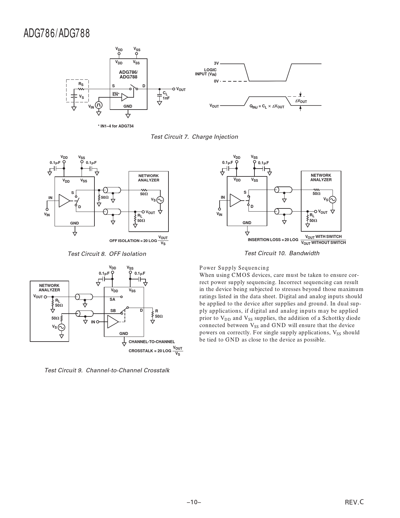 ADG786/ADG788VDDVSSVDDVSS3VLOGICADG786/INPUT (VADG788IN)0VRSSDVOUTCEN*LVS1nFVOUTVGNDVINOUTQINJ = CLVOUT* IN1–4 for ADG734 Test Circuit 7. Charge Injection VDDVSSVDDVSS0.1F0.1F0.1F0.1FNETWORKNETWORKVVANALYZERVDDVSSANALYZERDDSSS50S50IN50INVSVSDDVOUTVVOUTINRVLINRL5050GNDGNDVOUTVOUT WITH SWITCHOFF ISOLATION = 20 LOGINSERTION LOSS = 20 LOGVSVOUT WITHOUT SWITCH Test Circuit 8. OFF Isolation Test Circuit 10. Bandwidth VDDVSSPower Supply Sequencing0.1F0.1F When using CMOS devices, care must be taken to ensure cor- rect power supply sequencing. Incorrect sequencing can result NETWORKANALYZERV in the device being subjected to stresses beyond those maximum DDVSSVOUT ratings listed in the data sheet. Digital and analog inputs should SARL be applied to the device after supplies and ground. In dual sup- 50SBDR ply applications, if digital and analog inputs may be applied 5050 prior to VDD and VSS supplies, the addition of a Schottky diode INV connected between V S SS and GND will ensure that the device GND powers on correctly. For single supply applications, VSS should be tied to GND as close to the device as possible. CHANNEL-TO-CHANNELVOUTCROSSTALK = 20 LOGVS Test Circuit 9. Channel-to-Channel Crosstalk –10– REV.$