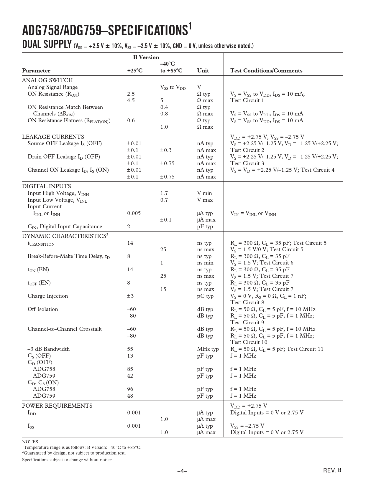 ADG758/ADG759–SPECIFICATIONS1 DUAL SUPPLY (VDD = +2.5 V. 10%, VSS = –2.5 V. 10%, GND = 0 V, unless otherwise noted.)