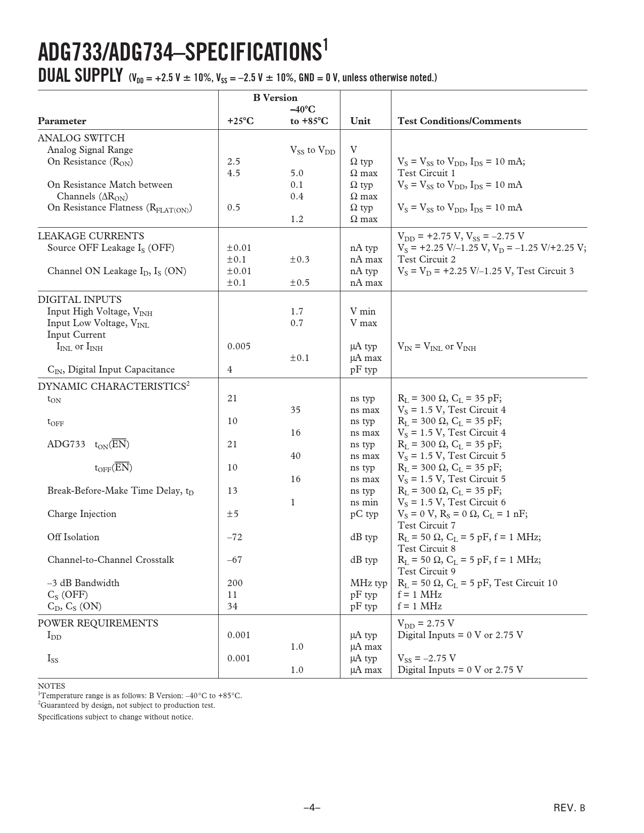 ADG733/ADG734–SPECIFICATIONS1 DUAL SUPPLY (VDD = +2.5 V 10%, VSS = –2.5 V 10%, GND = 0 V, unless otherwise noted.)