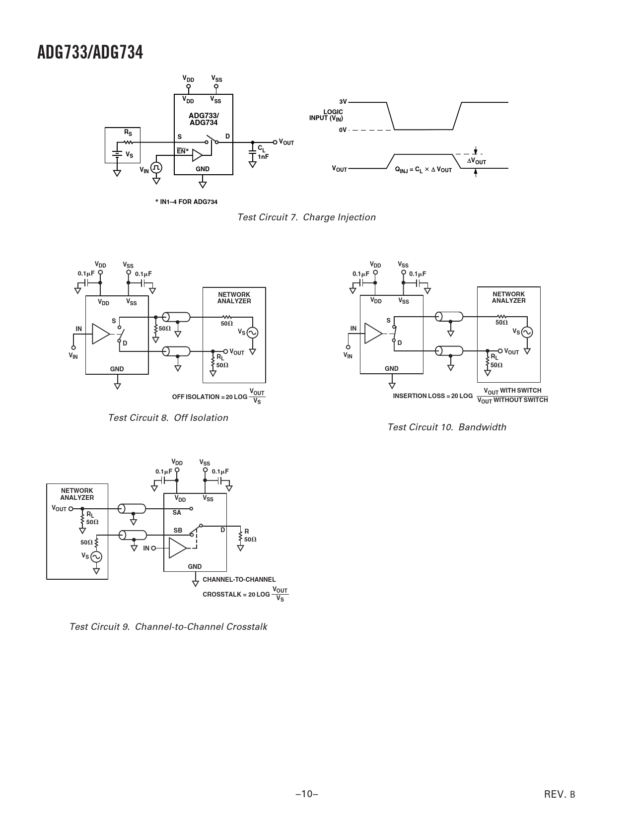 ADG733/ADG734. VDD. VSS. LOGIC. ADG733/. INPUT (V. ADG734. IN). VOUT. 1nF. GND. OUT. INJ = CL. * IN1–4 FOR ADG734. 0.1. NETWORK. ANALYZER