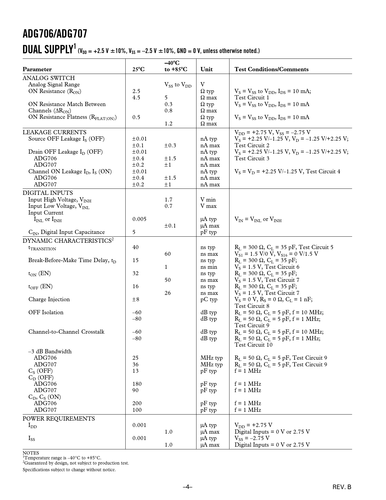 ADG706/ADG707DUAL SUPPLY1 (VDD = +2.5 V ⴞ 10%, VSS = –2.5 V ⴞ 10%, GND = 0 V, unless otherwise noted.)–40 ⴗ CParameter25 ⴗ Cto +85 ⴗ CUnitTest Conditions/Comments ANALOG SWITCH Analog Signal Range VSS to VDD V ON Resistance (RON) 2.5 Ω typ VS = VSS to VDD, IDS = 10 mA; 4.5 5 Ω max Test Circuit 1 ON Resistance Match Between 0.3 Ω typ VS = VSS to VDD, IDS = 10 mA Channels (∆RON) 0.8 Ω max ON Resistance Flatness (RFLAT(ON)) 0.5 Ω typ VS = VSS to VDD, IDS = 10 mA 1.2 Ω max LEAKAGE CURRENTS VDD = +2.75 V, VSS = –2.75 V Source OFF Leakage IS (OFF) ±0.01 nA typ VS = +2.25 V/–1.25 V, VD = –1.25 V/+2.25 V; ±0.1 ±0.3 nA max Test Circuit 2 Drain OFF Leakage ID (OFF) ±0.01 nA typ VS = +2.25 V/–1.25 V, VD = –1.25 V/+2.25 V; ADG706 ±0.4 ±1.5 nA max Test Circuit 3 ADG707 ±0.2 ±1 nA max Channel ON Leakage ID, IS (ON) ±0.01 nA typ VS = VD = +2.25 V/–1.25 V, Test Circuit 4 ADG706 ±0.4 ±1.5 nA max ADG707 ±0.2 ±1 nA max DIGITAL INPUTS Input High Voltage, VINH 1.7 V min Input Low Voltage, VINL 0.7 V max Input Current IINL or IINH 0.005 µA typ VIN = VINL or VINH ±0.1 µA max CIN, Digital Input Capacitance 5 pF typ DYNAMIC CHARACTERISTICS2 tTRANSITION 40 ns typ RL = 300 Ω, CL = 35 pF, Test Circuit 5 60 ns max VS1 = 1.5 V/0 V, VS16 = 0 V/1.5 V Break-Before-Make Time Delay, tD 15 ns typ RL = 300 Ω, CL = 35 pF; 1 ns min VS = 1.5 V, Test Circuit 6 tON (EN) 32 ns typ RL = 300 Ω, CL = 35 pF; 50 ns max VS = 1.5 V, Test Circuit 7 tOFF (EN) 16 ns typ RL = 300 Ω, CL = 35 pF; 26 ns max VS = 1.5 V, Test Circuit 7 Charge Injection ±8 pC typ VS = 0 V, RS = 0 Ω, CL = 1 nF; Test Circuit 8 OFF Isolation –60 dB typ RL = 50 Ω, CL = 5 pF, f = 10 MHz; –80 dB typ RL = 50 Ω, CL = 5 pF, f = 1 MHz; Test Circuit 9 Channel-to-Channel Crosstalk –60 dB typ RL = 50 Ω, CL = 5 pF, f = 10 MHz; –80 dB typ RL = 50 Ω, CL = 5 pF, f = 1 MHz; Test Circuit 10 –3 dB Bandwidth ADG706 25 MHz typ RL = 50 Ω, CL = 5 pF, Test Circuit 9 ADG707 36 MHz typ RL = 50 Ω, CL = 5 pF, Test Circuit 9 CS (OFF) 13 pF typ f = 1 MHz CD (OFF) ADG706 180 pF typ f = 1 MHz ADG707 90 pF typ f = 1 MHz CD, CS (ON) ADG706 200 pF typ f = 1 MHz ADG707 100 pF typ f = 1 MHz POWER REQUIREMENTS IDD 0.001 µA typ VDD = +2.75 V 1.0 µA max Digital Inputs = 0 V or 2.75 V ISS 0.001 µA typ VSS = –2.75 V 1.0 µA max Digital Inputs = 0 V or 2.75 V NOTES 1Temperature range is –40°C to +85°C. 2Guaranteed by design, not subject to production test. Specifications subject to change without notice. –4– REV. B