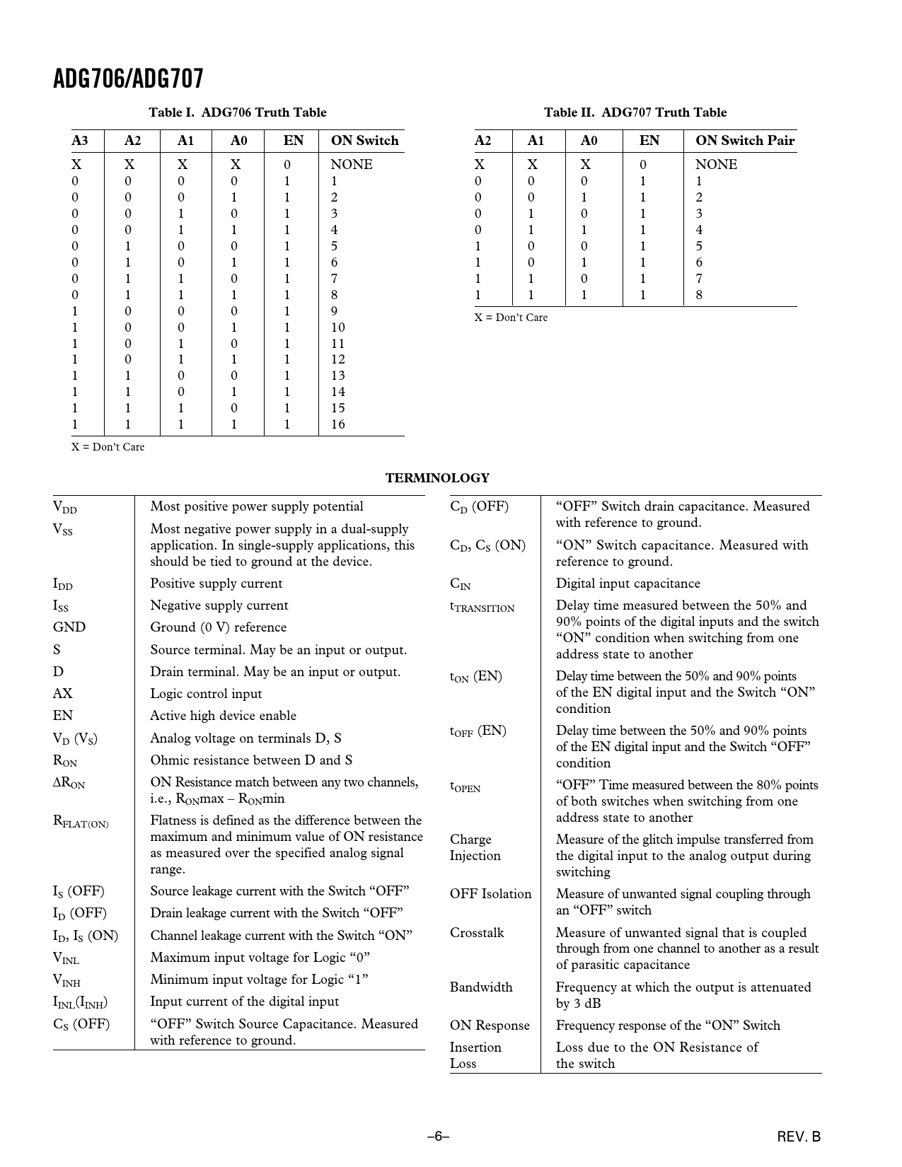 ADG706/ADG707 Table I ADG706 Truth Table Table II ADG707 Truth Table ON Switch ON Switch Pair TERMINOLOGY
