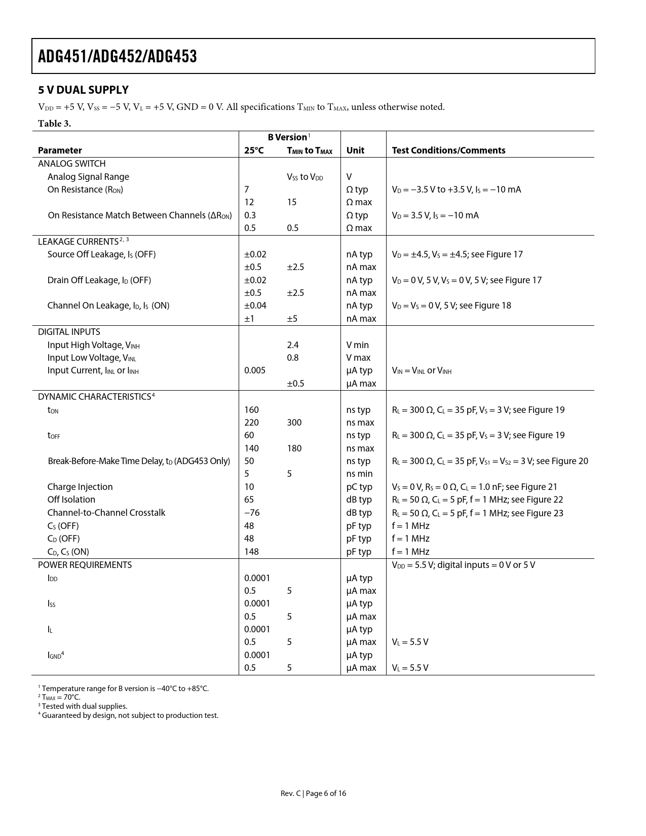 link to page 16 link to page 16 link to page 16 link to page 13 link to page 13 link to page 13 link to page 16 link to page 13 link to page 13 link to page 13 link to page 13 link to page 14 link to page 14 link to page 6 link to page 6 link to page 6 ADG451/ADG452/ADG4535 V DUAL SUPPLY VDD = +5 V, VSS = −5 V, VL = +5 V, GND = 0 V. All specifications TMIN to TMAX, unless otherwise noted. Table 3. BVersion 1 Parameter 25°CTMIN to TMAX UnitTestConditions/Comments ANALOG SWITCH Analog Signal Range VSS to VDD V On Resistance (RON) 7 Ω typ VD = −3.5 V to +3.5 V, IS = −10 mA 12 15 Ω max On Resistance Match Between Channels (ΔRON) 0.3 Ω typ VD = 3.5 V, IS = −10 mA 0.5 0.5 Ω max LEAKAGE CURRENTS2, 3 Source Off Leakage, IS (OFF) ±0.02 nA typ VD = ±4.5, VS = ±4.5; see Figure 17 ±0.5 ±2.5 nA max Drain Off Leakage, ID (OFF) ±0.02 nA typ VD = 0 V, 5 V, VS = 0 V, 5 V; see Figure 17 ±0.5 ±2.5 nA max Channel On Leakage, ID, IS (ON) ±0.04 nA typ VD = VS = 0 V, 5 V; see Figure 18 ±1 ±5 nA max DIGITAL INPUTS Input High Voltage, VINH 2.4 V min Input Low Voltage, VINL 0.8 V max Input Current, IINL or IINH 0.005 μA typ VIN = VINL or VINH ±0.5 μA max DYNAMIC CHARACTERISTICS4 tON 160 ns typ RL = 300 Ω, CL = 35 pF, VS = 3 V; see Figure 19 220 300 ns max tOFF 60 ns typ RL = 300 Ω, CL = 35 pF, VS = 3 V; see Figure 19 140 180 ns max Break-Before-Make Time Delay, tD (ADG453 Only) 50 ns typ RL = 300 Ω, CL = 35 pF, VS1 = VS2 = 3 V; see Figure 20 5 5 ns min Charge Injection 10 pC typ VS = 0 V, RS = 0 Ω, CL = 1.0 nF; see Figure 21 Off Isolation 65 dB typ RL = 50 Ω, CL = 5 pF, f = 1 MHz; see Figure 22 Channel-to-Channel Crosstalk −76 dB typ RL = 50 Ω, CL = 5 pF, f = 1 MHz; see Figure 23 CS (OFF) 48 pF typ f = 1 MHz CD (OFF) 48 pF typ f = 1 MHz CD, CS (ON) 148 pF typ f = 1 MHz POWER REQUIREMENTS VDD = 5.5 V; digital inputs = 0 V or 5 V IDD 0.0001 μA typ 0.5 5 μA max ISS 0.0001 μA typ 0.5 5 μA max IL 0.0001 μA typ 0.5 5 μA max VL = 5.5 V I 4 GND 0.0001 μA typ 0.5 5 μA max VL = 5.5 V 1 Temperature range for B version is −40°C to +85°C. 2 TMAX = 70°C. 3 Tested with dual supplies. 4 Guaranteed by design, not subject to production test. Rev. C | Page 6 of 16 Document Outline FEATURES APPLICATIONS GENERAL DESCRIPTION FUNCTIONAL BLOCK DIAGRAMS TABLE OF CONTENTS REVISION HISTORY PRODUCT HIGHLIGHTS SPECIFICATIONS 15 V DUAL SUPPLY 12 V SINGLE SUPPLY 5 V DUAL SUPPLY ABSOLUTE MAXIMUM RATINGS ESD CAUTION PIN CONFIGURATION AND FUNCTION DESCRIPTIONS TYPICAL PERFORMANCE CHARACTERISTICS TERMINOLOGY APPLICATIONS TEST CIRCUITS OUTLINE DIMENSIONS ORDERING GUIDE