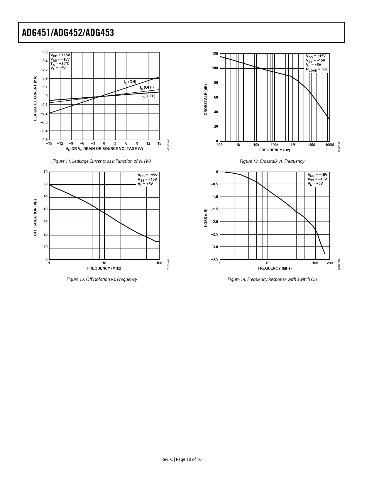 ADG451/ADG452/ADG4530.5 V120DD = +15VVDD = +15V0.4 VSS = –15VVSS = –15VTA = +25°CVL = +5V0.3 VL = +5V100RLOAD = 50ΩA)0.2n (ID (ON))80NT0.1IBS (OFF)dRREK (0ID (OFF)L A60CUTE –0.1S S40AKAG –0.2CROE L –0.320–0.4 9 –0.50 -00 –15–12–9–6–303691215 11 9 0 1001k10k100k1M10M100M 9- 23 VD OR VS DRAIN OR SOURCE VOLTAGE (V) 23 05 FREQUENCY (Hz) 05 Figure 11. Leakage Currents as a Function of VD (VS) Figure 13. Crosstalk vs. Frequency 700VDD = +15VVDD = +15VVSS = –15VVSS = –15V60VL = +5V–0.5VL = +5V50–1.0B) d N (40) –1.5IOdBAT(LS SO30–2.0S ILOF F O20–2.510–3.00–3.5 10 12 0 110100 0 9- 110100200 9- 23 FREQUENCY (MHz) 23 FREQUENCY (MHz) 05 05 Figure 12. Off Isolation vs. Frequency Figure 14. Frequency Response with Switch On Rev. C | Page 10 of 16 Document Outline FEATURES APPLICATIONS GENERAL DESCRIPTION FUNCTIONAL BLOCK DIAGRAMS TABLE OF CONTENTS REVISION HISTORY PRODUCT HIGHLIGHTS SPECIFICATIONS 15 V DUAL SUPPLY 12 V SINGLE SUPPLY 5 V DUAL SUPPLY ABSOLUTE MAXIMUM RATINGS ESD CAUTION PIN CONFIGURATION AND FUNCTION DESCRIPTIONS TYPICAL PERFORMANCE CHARACTERISTICS TERMINOLOGY APPLICATIONS TEST CIRCUITS OUTLINE DIMENSIONS ORDERING GUIDE