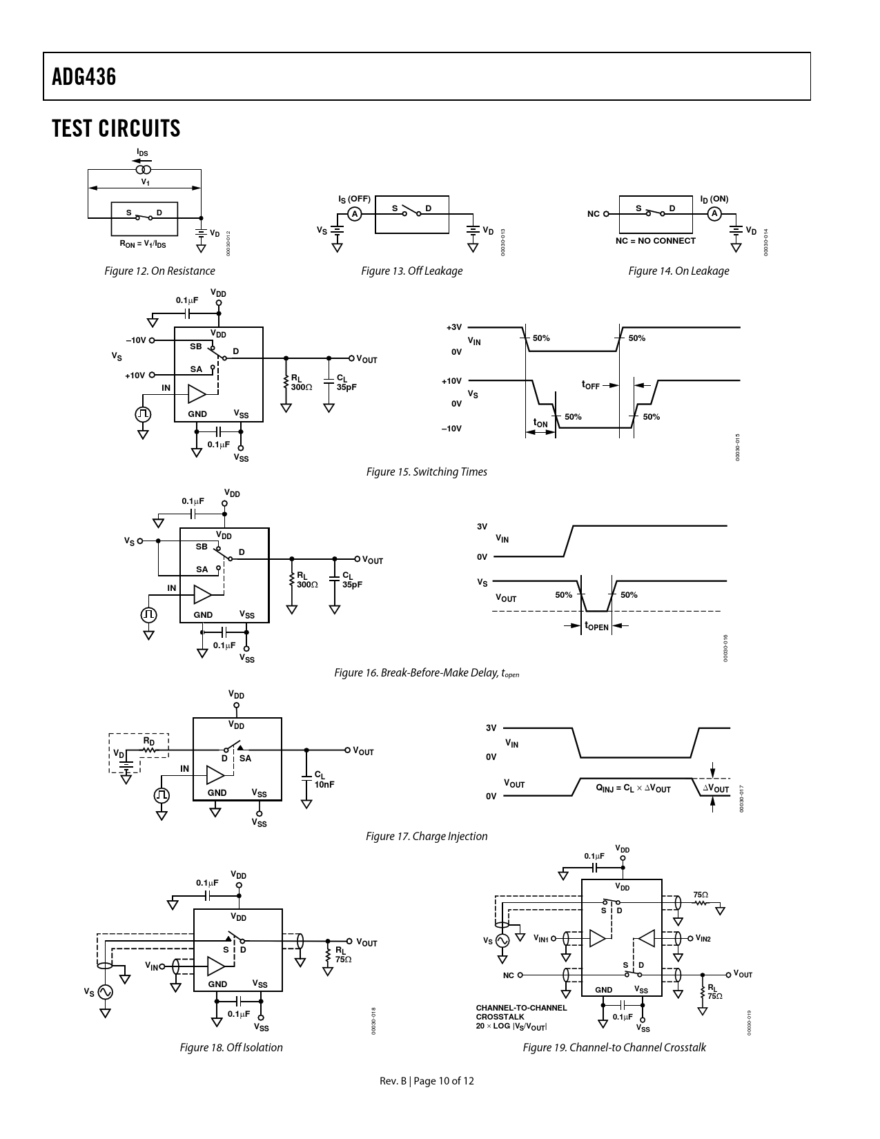ADG436. TEST CIRCUITS. IDS. IS (OFF). ID (ON). NC = NO CONNECT. ON = V1/IDS. VDD. 0.1. +3V. –10V. 50%. VOUT. +10V. 300. 35pF. tOFF. GND. VSS. tON. VIN. OUT. tOPEN