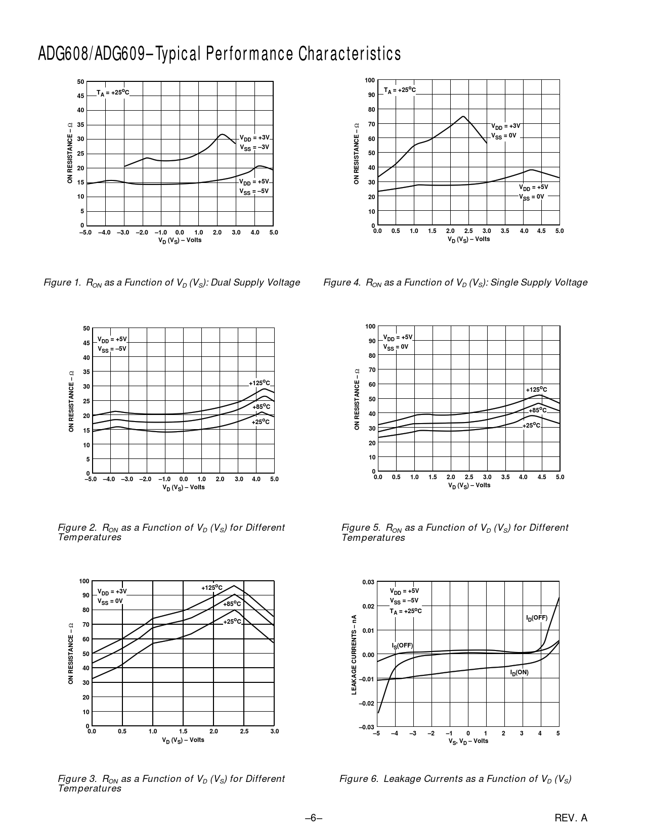 ADG608/ADG609–Typical Performance Characteristics50100TTA = +25oC45A = +25oC904080 Ω 35 Ω 70VDD = +3V V30VDD = +3V60SS = 0VVSS = –3V25502040ON RESISTANCE – 15VDD = +5VON RESISTANCE –30VVDD = +5VSS = –5V1020VSS = 0V51000–5.0–4.0–3.0–2.0–1.00.01.02.03.04.05.00.00.51.01.52.02.53.03.54.04.55.0VVD (VS) – VoltsD (VS) – Volts Figure 1. RON as a Function of VD (VS): Dual Supply Voltage Figure 4. RON as a Function of VD (VS): Single Supply Voltage 50100VVDD = +5V45DD = +5V90VVSS = –5VSS = 0V4080 Ω 35 Ω 70+125oC3060+125oC2550+85oC+85oC2040+25oC+25oCON RESISTANCE –15ON RESISTANCE –30102051000–5.0–4.0–3.0–2.0–1.00.01.02.03.04.05.00.00.51.01.52.02.53.03.54.04.55.0VVD (VS) – VoltsD (VS) – Volts Figure 2. RON as a Function of VD (VS) for Different Figure 5. RON as a Function of VD (VS) for Different Temperatures Temperatures 1000.03+125oCVV90DD = +3VDD = +5VVVSS = 0V+85oCSS = –5V0.0280TA = +25oCID(OFF) Ω 70+25oC0.0160IS(OFF)500.0040ID(ON)–0.01ON RESISTANCE –30LEAKAGE CURRENTS – nA20–0.02100–0.030.00.51.01.52.02.53.0–5–4–3–2–1012345VD (VS) – VoltsVS, VD – Volts Figure 3. RON as a Function of VD (VS) for Different Figure 6. Leakage Currents as a Function of VD (VS) Temperatures –6– REV. A