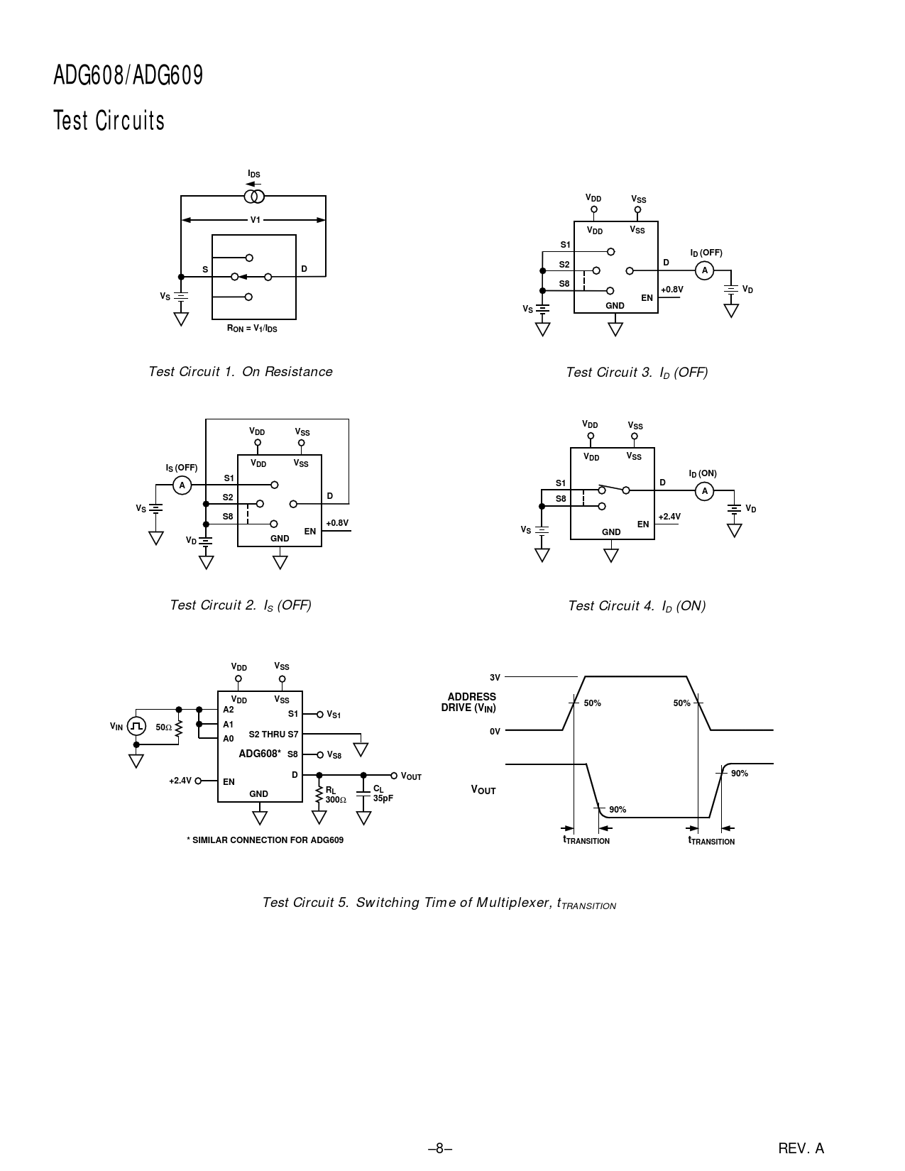 ADG608/ADG609. Test Circuits. IDS. VDD. VSS. ID (OFF). +0.8V. GND. RON = V1/IDS. S (OFF). ID (ON). +2.4V. ADDRESS. 50%. DRIVE (VIN). VS1. VIN. S2 THRU S7